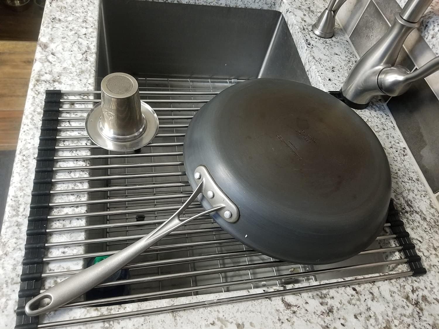 - Roll up Sink Drying Rack and Spacing-saving Dish Drying Mat: This dish drainer can roll up and go in a drawer quickly when not in use. Works great and keeps the kitchen sink area looking neat, the best one of dish drainers for kitchen counter. You can roll up this over the sink dish drying rack as much as you like during using it and for the pipes also can be removable