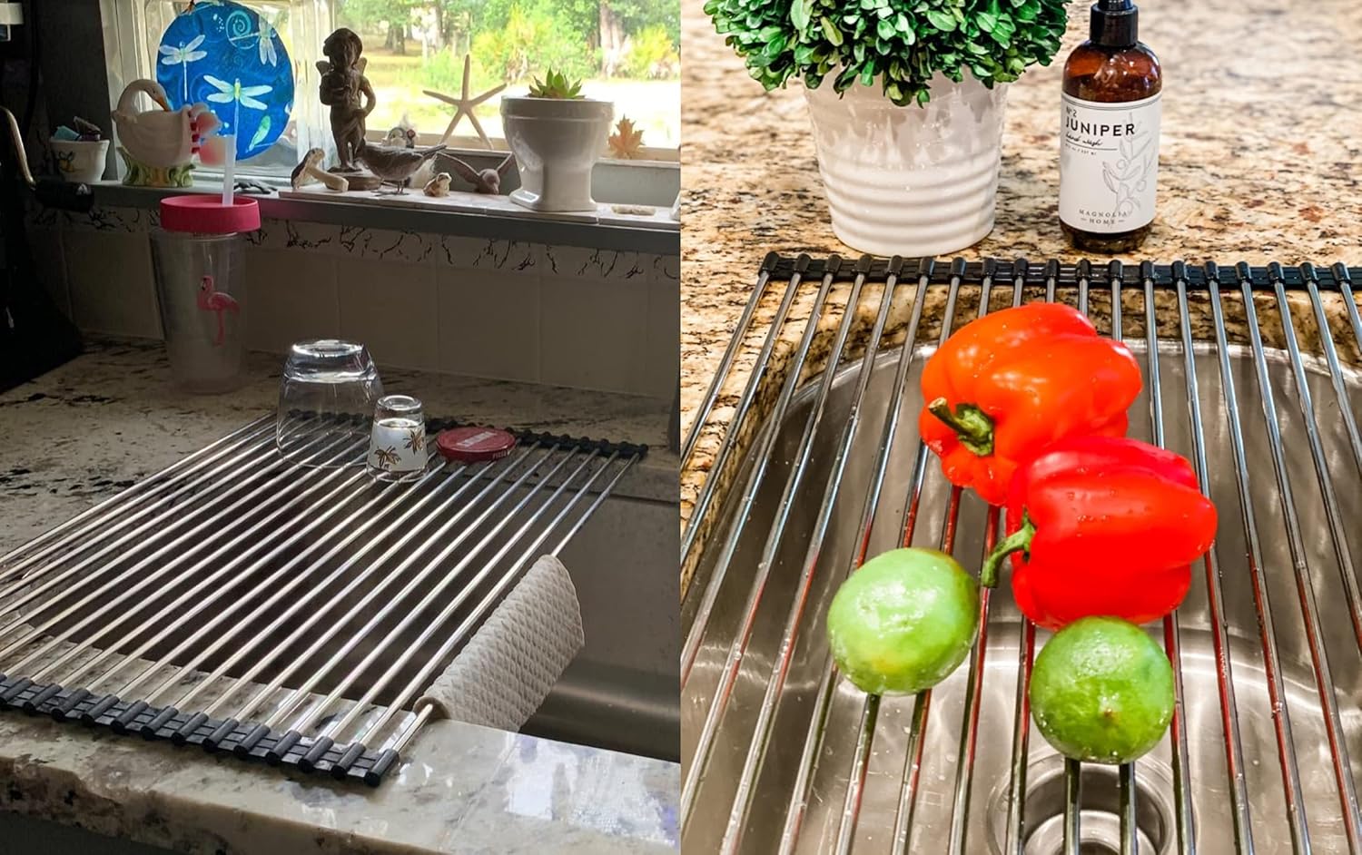 - Multi-use Folding Dish Drying Rack: This roll up drying rack unrolls above an open sink for air-drying washed dishes, for additional counter top space, or as a trivet. Vegetable and fruit dish drainers, great kitchen dish racks for counter