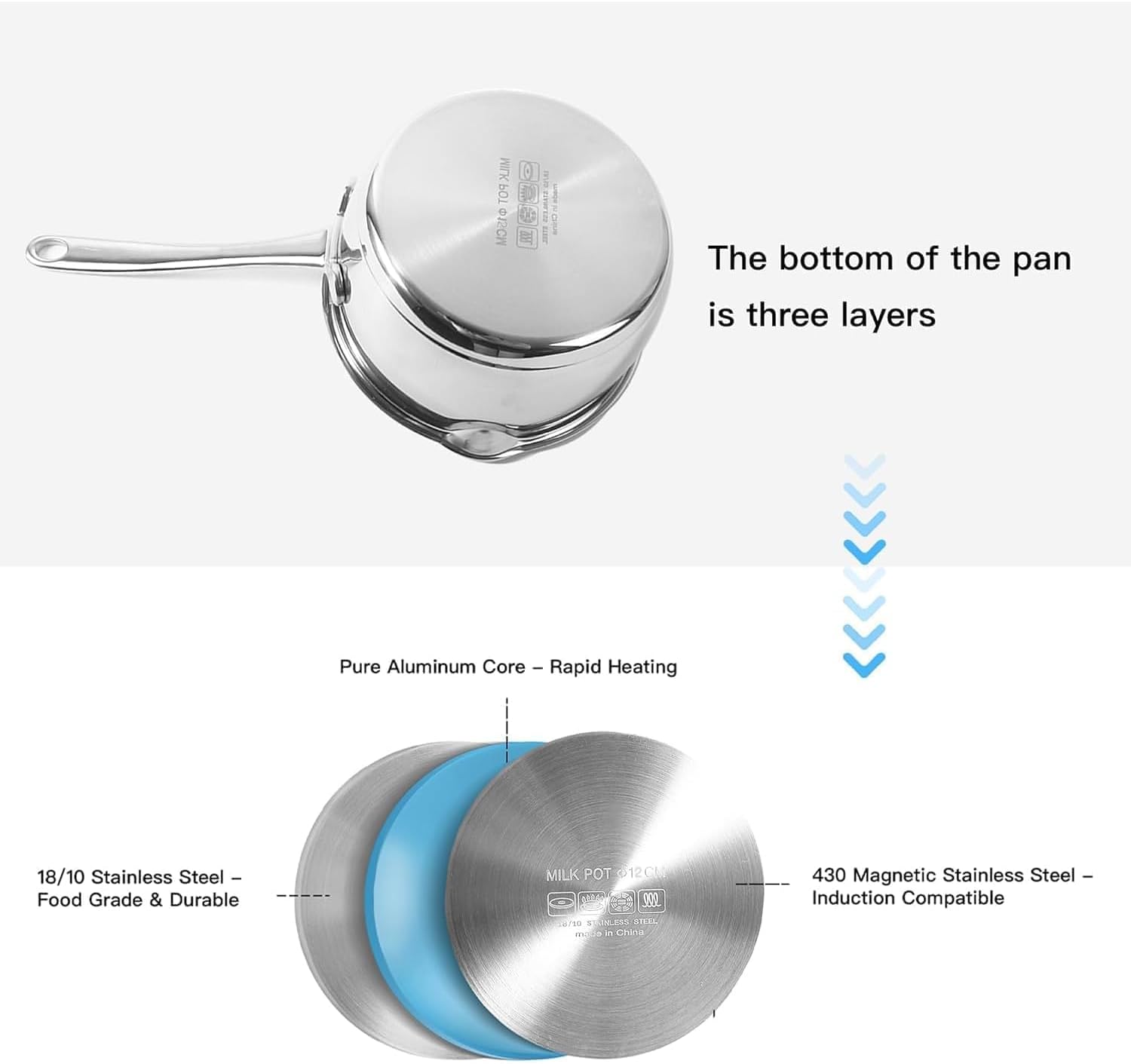 - Tri-Ply Construction: Built with 18/10 stainless steel interior, magnetic stainless steel exterior, and a pure aluminum core, this pan’s 3-layer design ensures fast, even heat distribution. The warp-resistant tri-ply base excels at slow simmering, melting, or braising. Dishwasher safe.