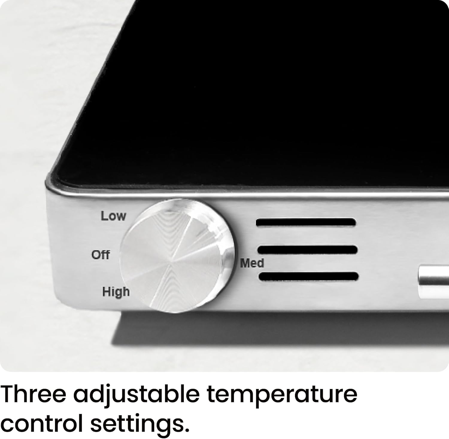 - SLEEK GLASS TOP: Sleek space saving design with black tempered glass top and stainless steel accents looks great on any table or buffet. Revolutionary glass plate design makes cleaning a breeze.