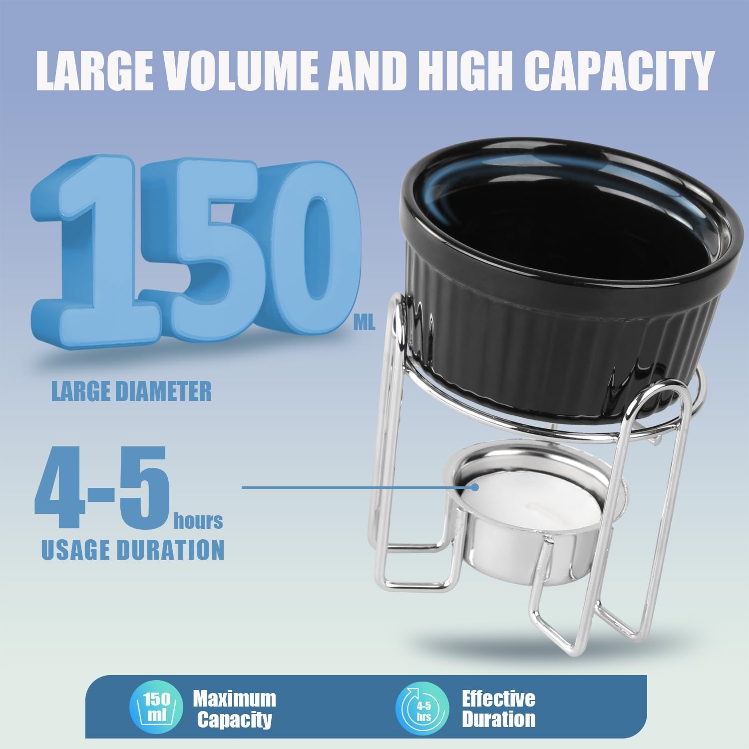 - BIGGER CAPACITY - Our butter warmers have an adequate capacity of approximately 5.1 oz/ 150 ml, large enough to hold a decent amount of anything, making them a nice portion for lobster crab. The candles and metal stands have the ideal dimensions, about 1.37 x 0.43 inches for the candles, and about 3.14 x 3.18 inches for the stands, offering a practical and compact design, durable for long-term use. Fancy enough to use on any occasion!