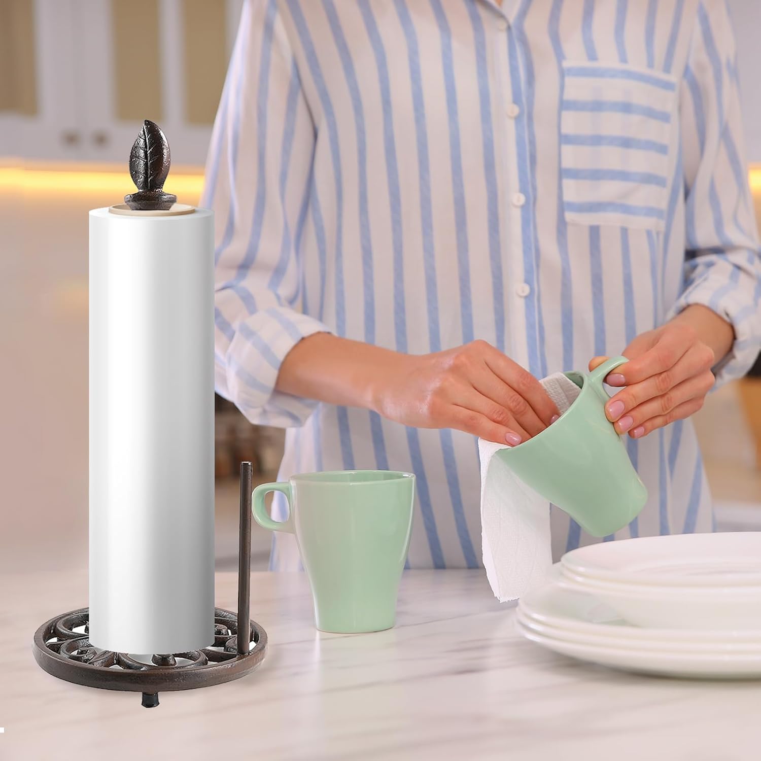 JOGREFUL Paper Towel Holder Stand, Cast Iron Kitchen Paper Towel Countertop Vintage Stand with Weighted-Base, Bathroom Organization for Family Standard Large Size Roll Paper, Leaf Top, Brown