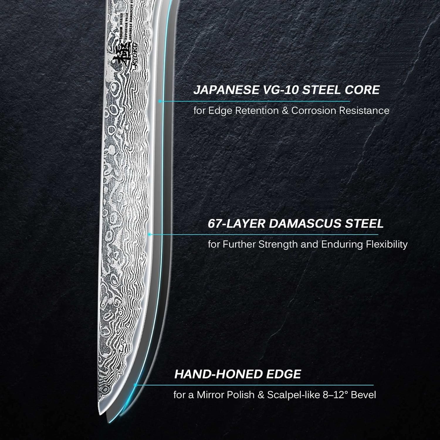 - VG-10 JAPANESE SUPER STEEL - Manufactured with ultra-sharp VG-10 Japanese Damascus steel cutting core at HRC 58-60 hardness, this 7 in. crafted culinary boning knife comes with unrivaled performance and incredible edge retention; cobalt added VG-10 steel outperforms AUS-10 steel in durability and is easier to sharpen as cobalt enhance the other alloying elements
