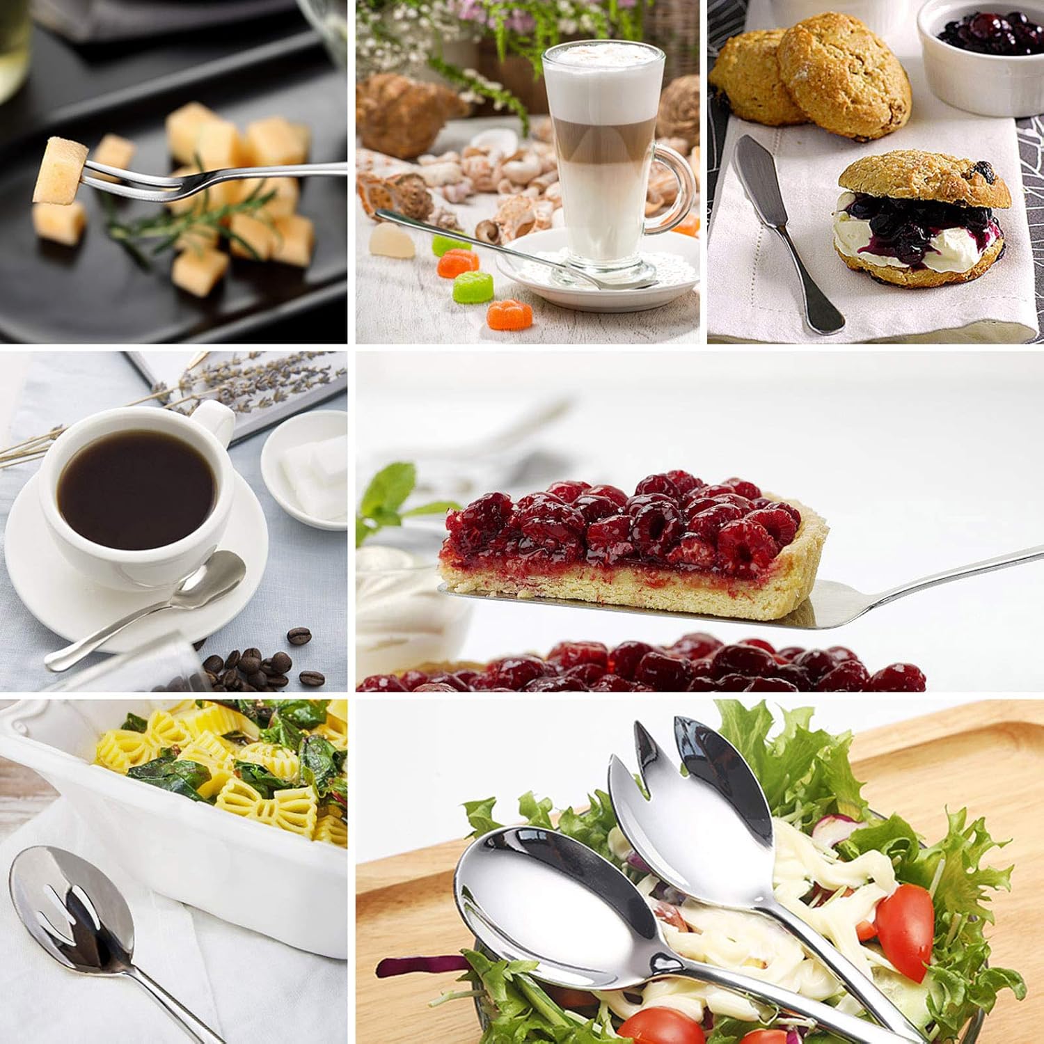 - Included Components : 9 inches dinner knives, 8 inches dinner forks, 8 inches dinner spoons, 6.7 inches salad forks, 6.7 inches teaspoons, 8 piece serving set including 8.8 inches slotted serving spoon, 8.8 inches serving spoon, 8.8 inches pie server, 8 inches salad spork, 7.7 inches long handle spoon, 6 inches butter knife, 5.8 inches fruit fork, 5 inches sugar spoon 9 inches dinner knives, 8 inches dinner forks, 8 inches dinner spoons, 6.7 inches salad forks, 6.7 inches teaspoons, 8 piece serving set including 8.8 inches slotted serving spoon, 8.8 i⦠See more