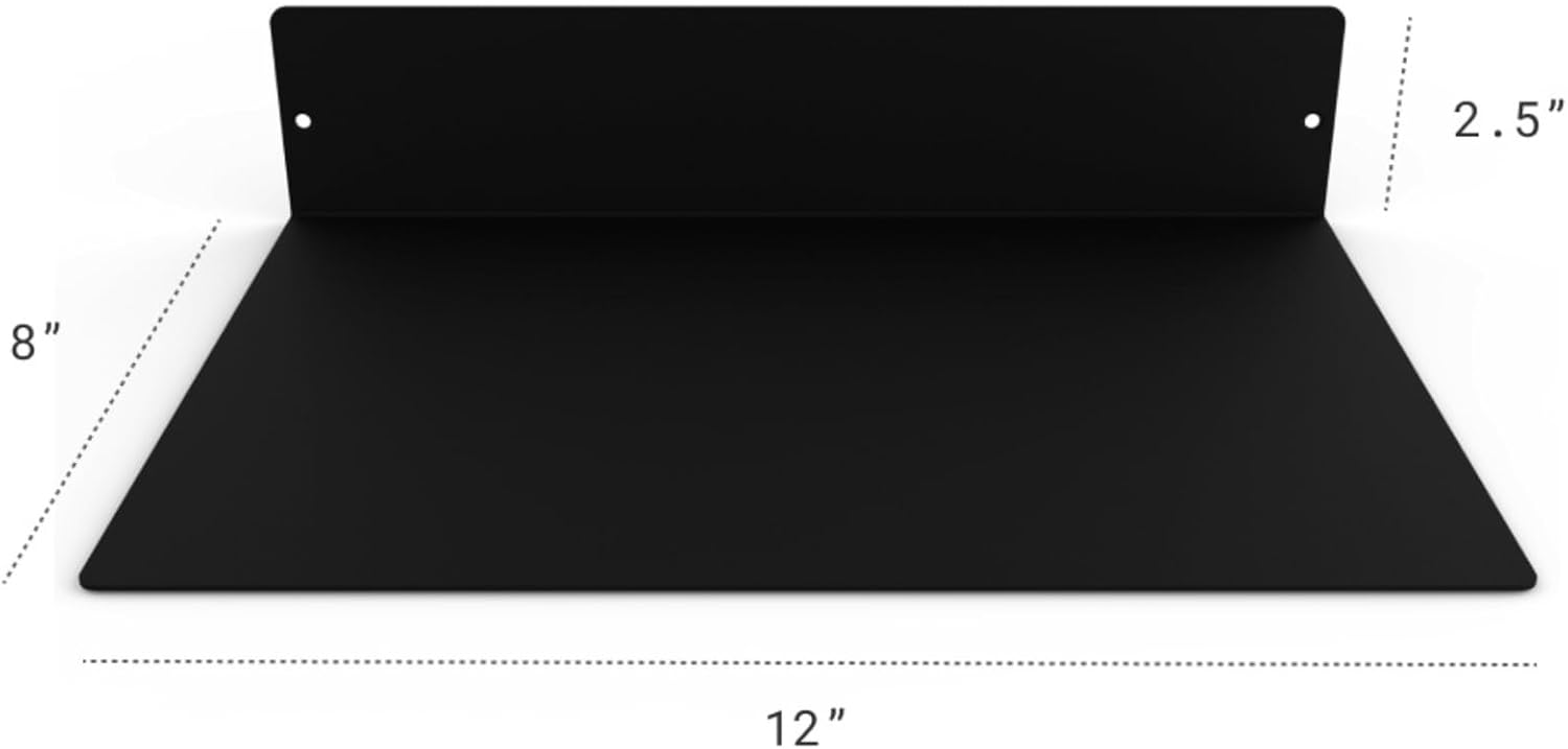 - DIMENSIONS & DETAILS: Measuring 12-inches long x 8-inches in depth, our steel floating shelf is made from 14 gauge raw steel and professionally powder coated matte black. The weight of the shelf is 2.5 LBS. It's perfect for displaying books, plants, bottles, picture ledges, and retail displays