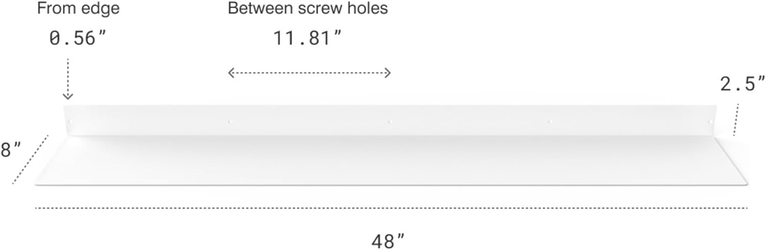 - DIMENSIONS & DETAILS: Measuring 48-inches long x 8-inches in depth, our steel floating shelf is made from 14 gauge raw steel and professionally powder coated white. The weight of the shelf is 10.25 LBS. It's perfect for displaying books, plants, bottles, picture ledges, and retail displays