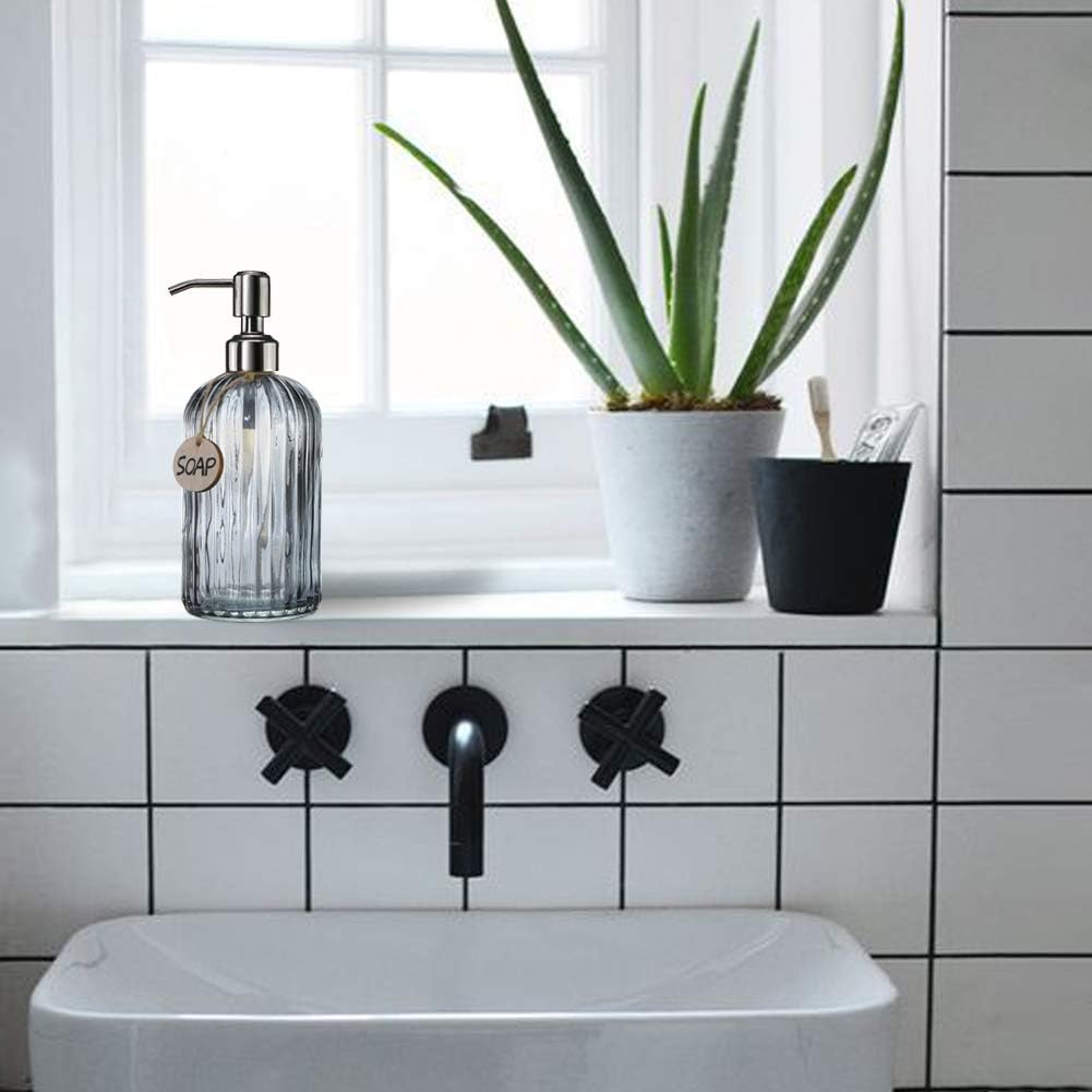 - VERSATILE GLASS SOAP DISPENSER: Our Dispenser Bottle is Covered With Gray Color Coating, You Can Use It As Kitchen Soap Dispenser Or Fill It With Lotion As A Farmhouse Style And Practical Bathroom Decor.