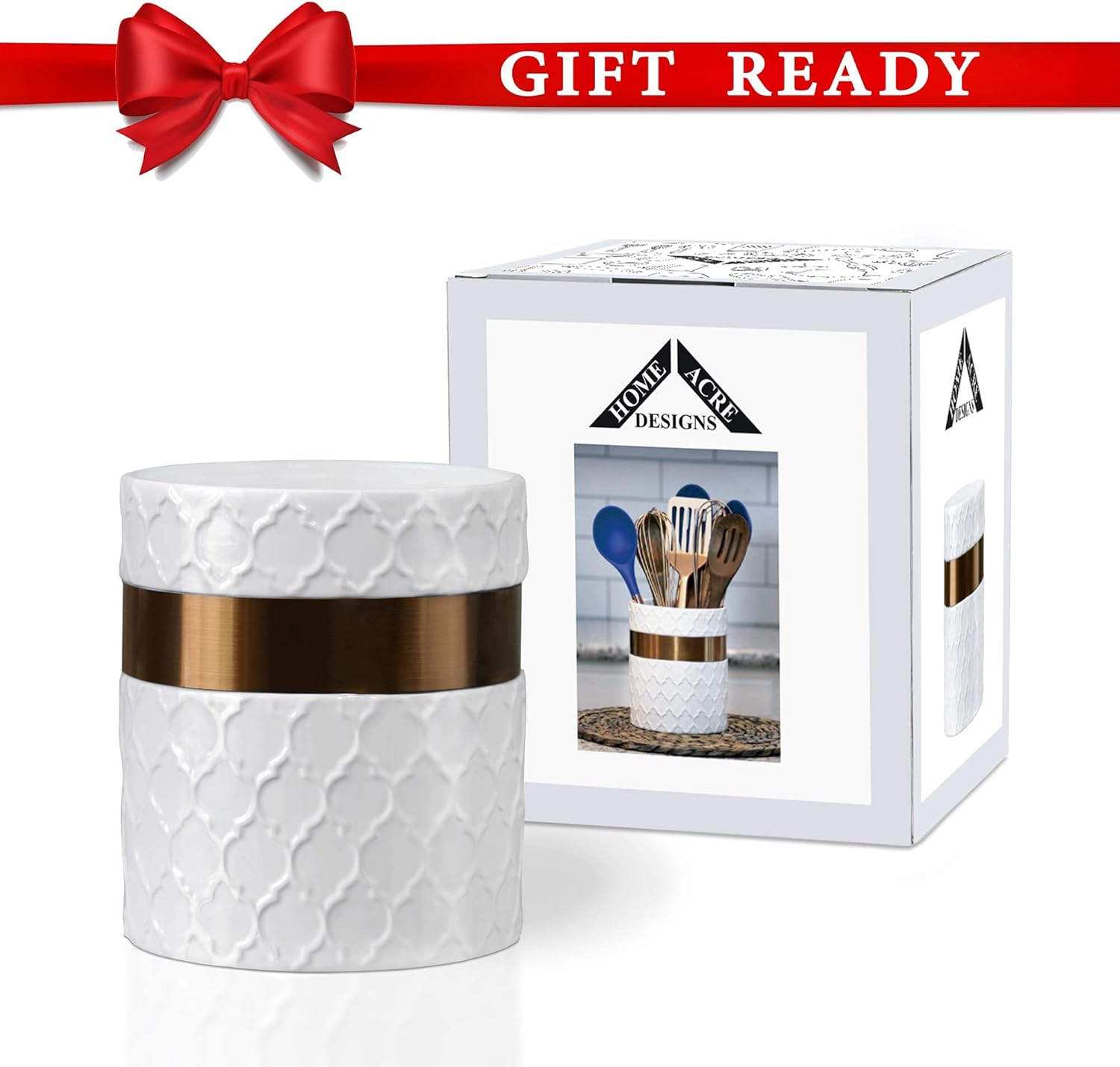 Home Acre Designs Kitchen Utensil Holder - Large Ceramic Farmhouse Countertop Crock, White/Copper
