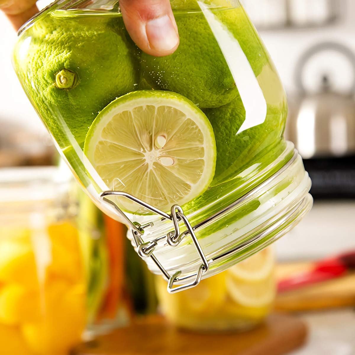 - Crafted of lead-free glass, easy-to-open latch and glass lid, wide mouth for easy filling.