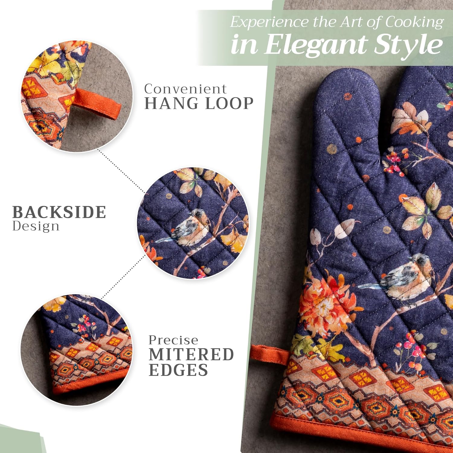 - Artistic style: Add charm to your kitchen with our oven mitt pot holder set featuring watercolor designs inspired by traditional European motifs. Stylish and functional kitchen accessories for every home cook or gift occasion.