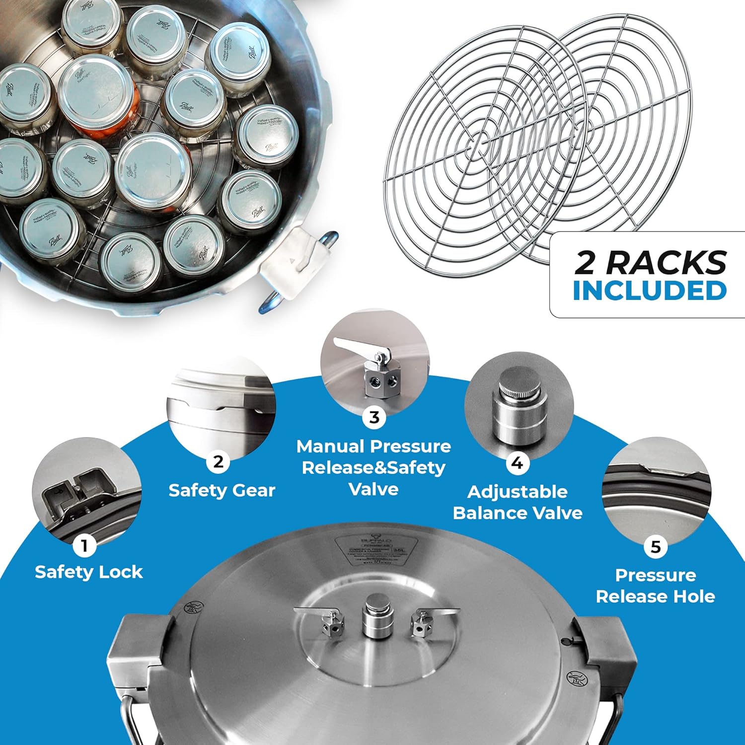 Buffalo 37 Quart Stainless Steel Pressure Cooker Extra Large Canning Pot with Rack and Lid for Commercial Use - Easy to Clean Stove Top Pressure Canner, Can Cooker - Safety Goods Certificate QCP435