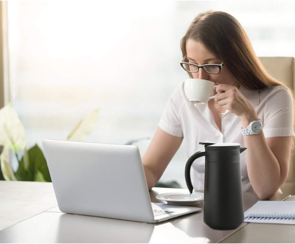 - SINGLE HAND POURING, USER FRIENDLY: Pour spout opens easily when press the push button, making one-handed pouring of this thermal pot simple. It's safe to touch the coffee flask exterior body either it is a hot or cold beverage inside as the temperature is locked in and the carafe body stays cool.