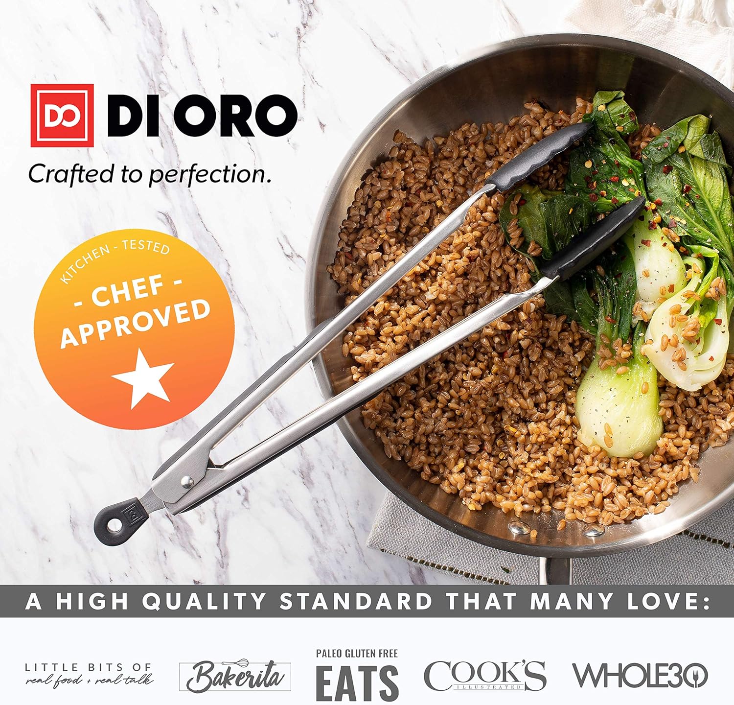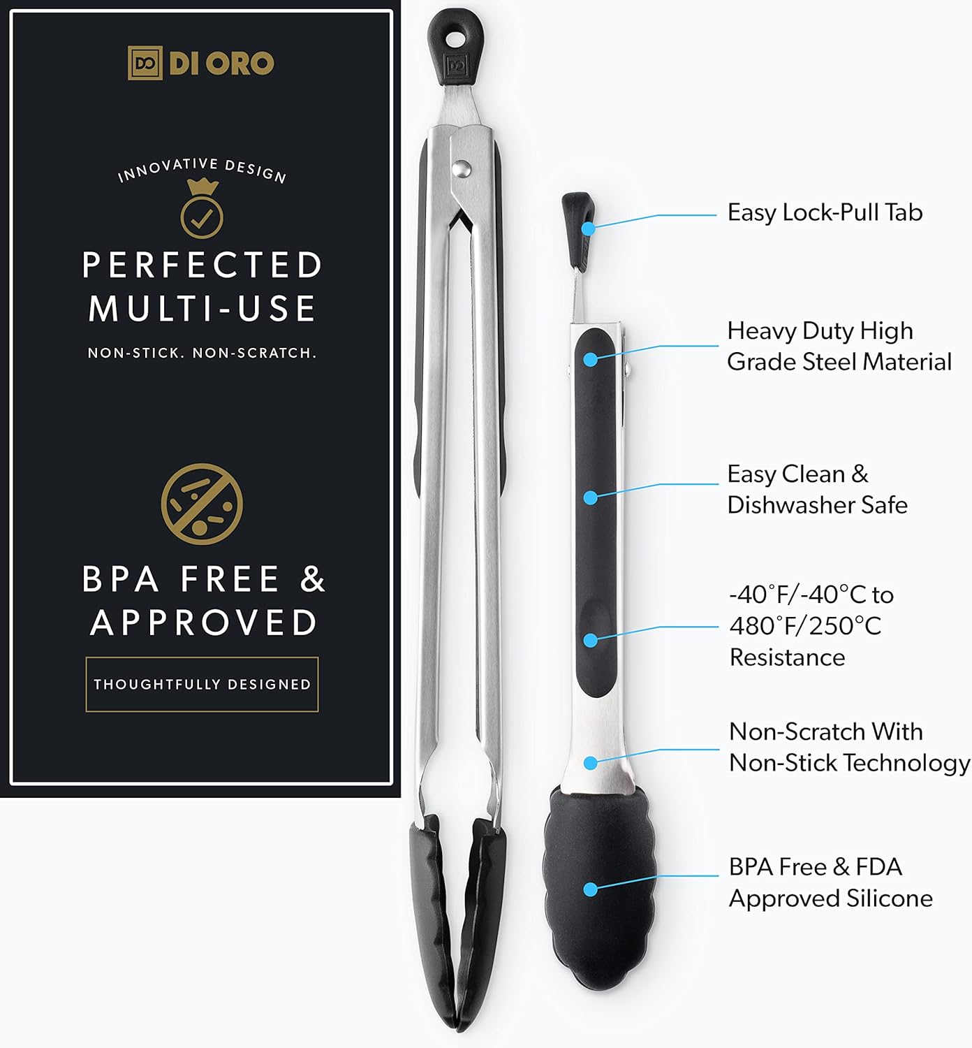 - HEAVY-DUTY STAINLESS-STEEL KITCHEN TONGS - While cheap and inferior tongs consistently fail, the DI ORO 2-Piece Silicone Kitchen Tong Set is engineered with heavy-duty stainless steel and silicone tips to prevent scratches and damage to your cookware. Each set will stand the test of time as they have been rigorously kitchen tested and expertly sized (9โ and 12โ) to ensure a multitude of applications can be used on a daily basis in home and commercial kitchens.