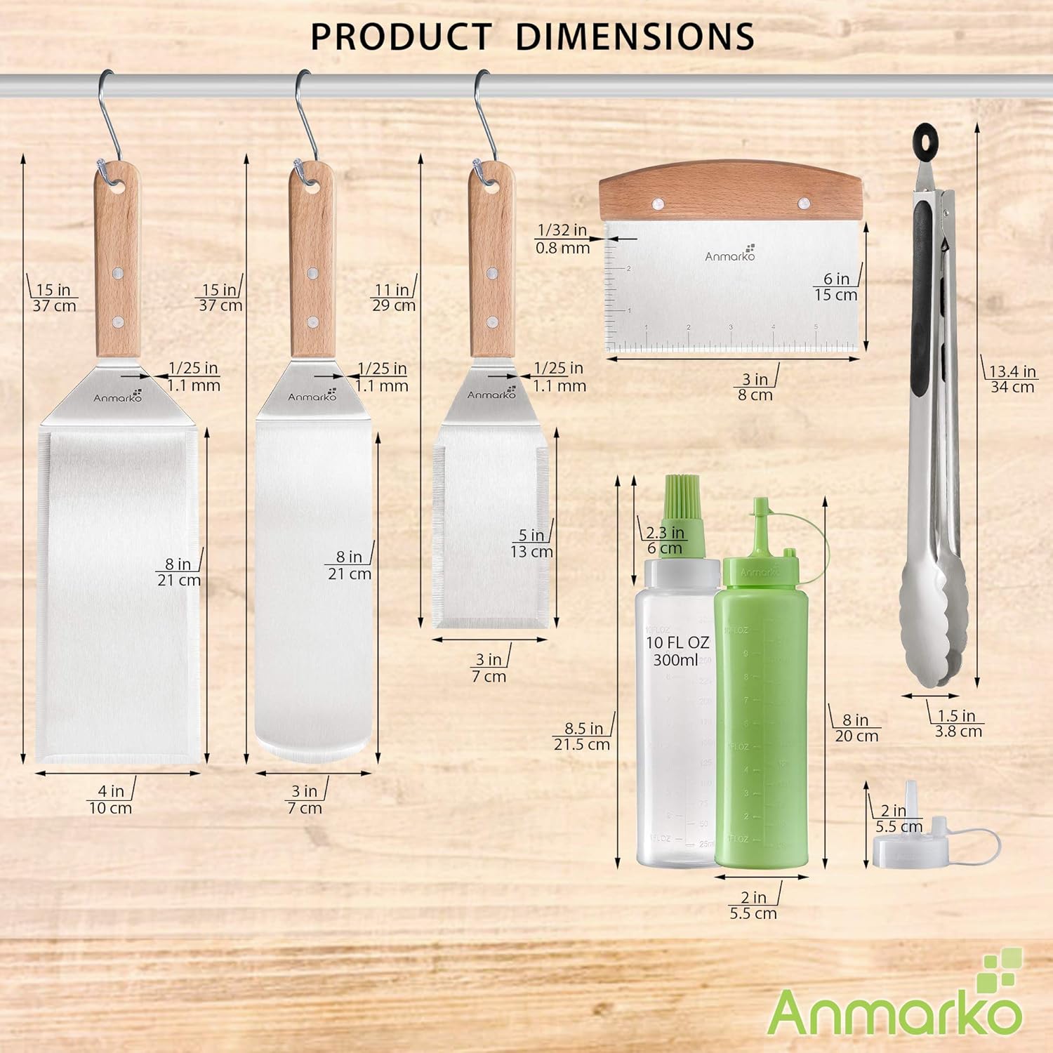 - Professional Stainless steel spatula set - includes 1 x cooking spatula turner, 1 x grill spatula, 1 x hamburger turner 4 x 8 inch, 1 x griddle scraper, 1 x grill tongs, 2 x squeeze bottles with silicone brush lid.