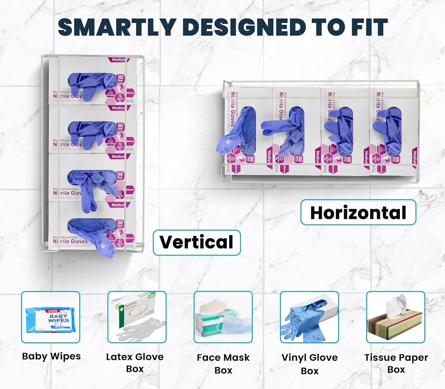 - EASY INSTALLATION. You can attach the glove dispenser onto any wall, cabinet or flat surface in no time. Equipped with keyholes for quick and easy installation, it can also be mounted either vertically or horizontally for added convenience.