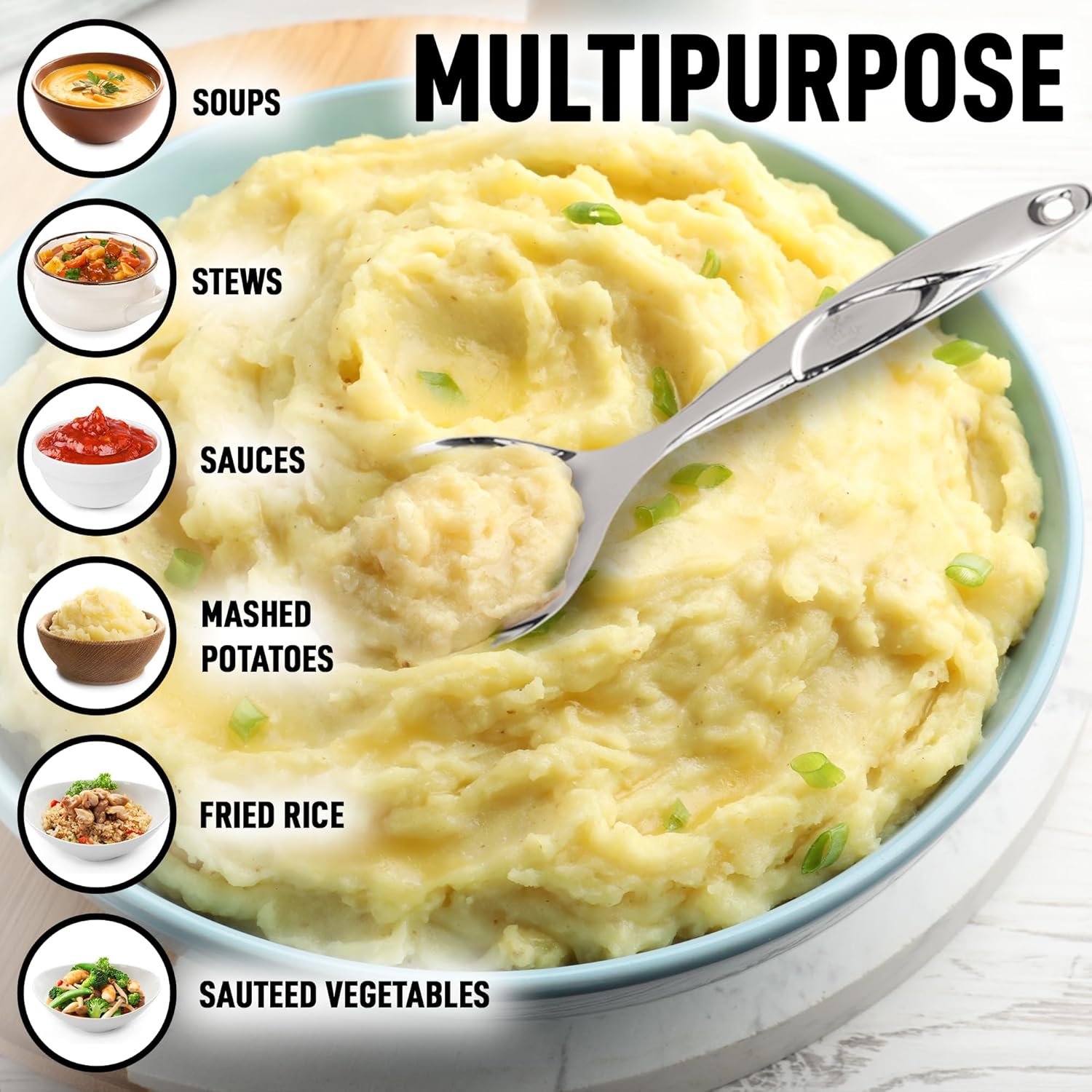 - STURDY STAINLESS STEEL: From an intimate family dinner at home to a large gathering in your backyard, the Zulay Kitchen Serving Spoon has got you covered! Made with top-grade stainless steel that is durable, sturdy, and long-lasting. Its polished mirror finish provides a smooth texture with no rough edges giving this tool an elegant look that matches any kitchen utensil set.