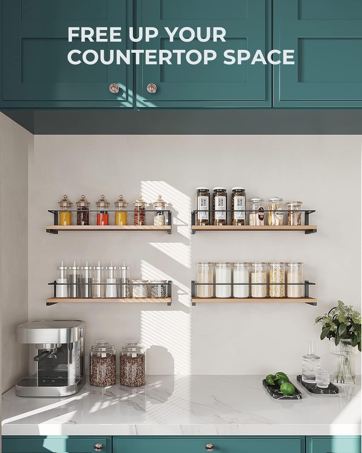 - Sturdy and Durable:The wall mounted spice rack is made of high quality solid wood boards and powder coated metal brackets. To ensure sturdiness and has a stronger bearing capacity. The solid wood provides a flat & smooth surface can efficiently resist the corruption from water and easy to be cleaned