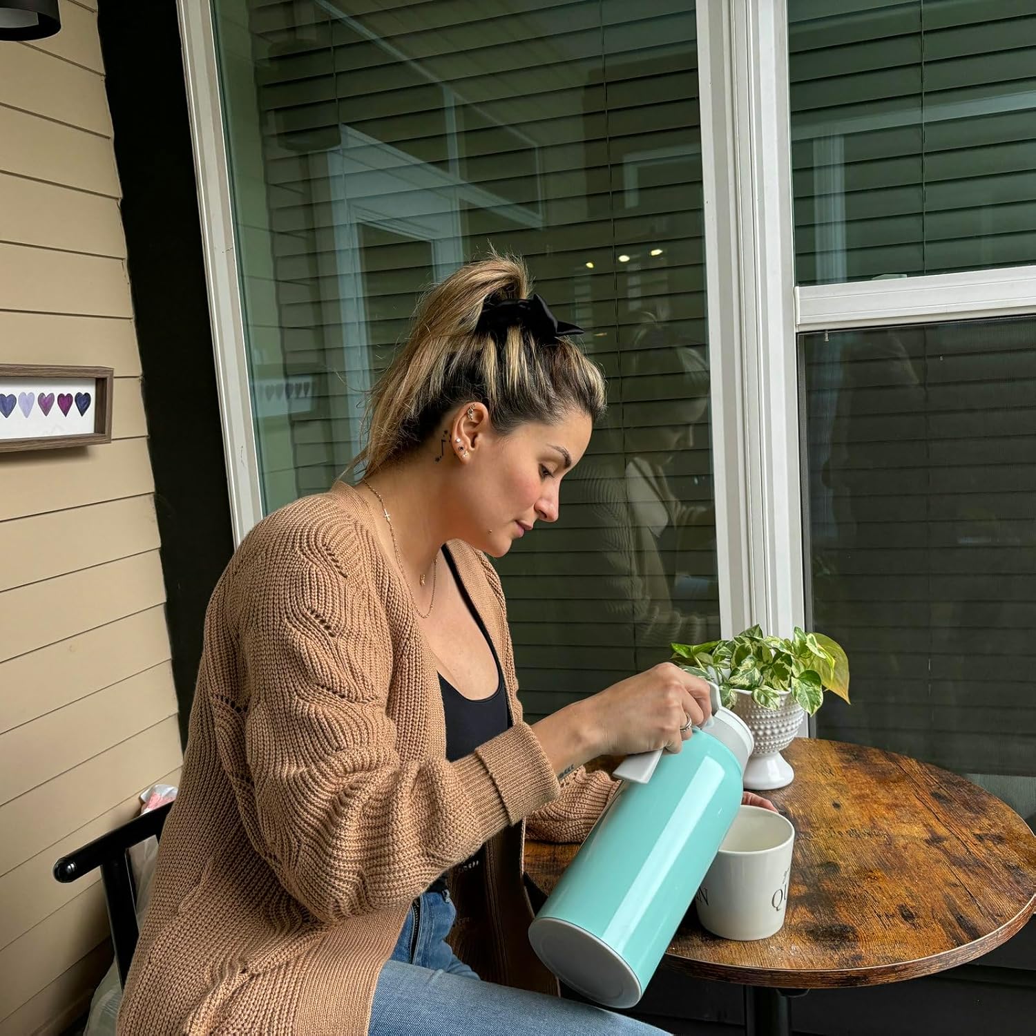 - USER FRIENDLY: GiNT 51 oz large thermal carafe features extra wide top opening, easy for cleaning and adding ice cubes. Itβs comfortable handle design is made for single hand, simple-push button enables pouring without leaking, dripping or spilling. Ideal used as bedside, restaurant, office, party, camping, travel insulated coffee carafes.