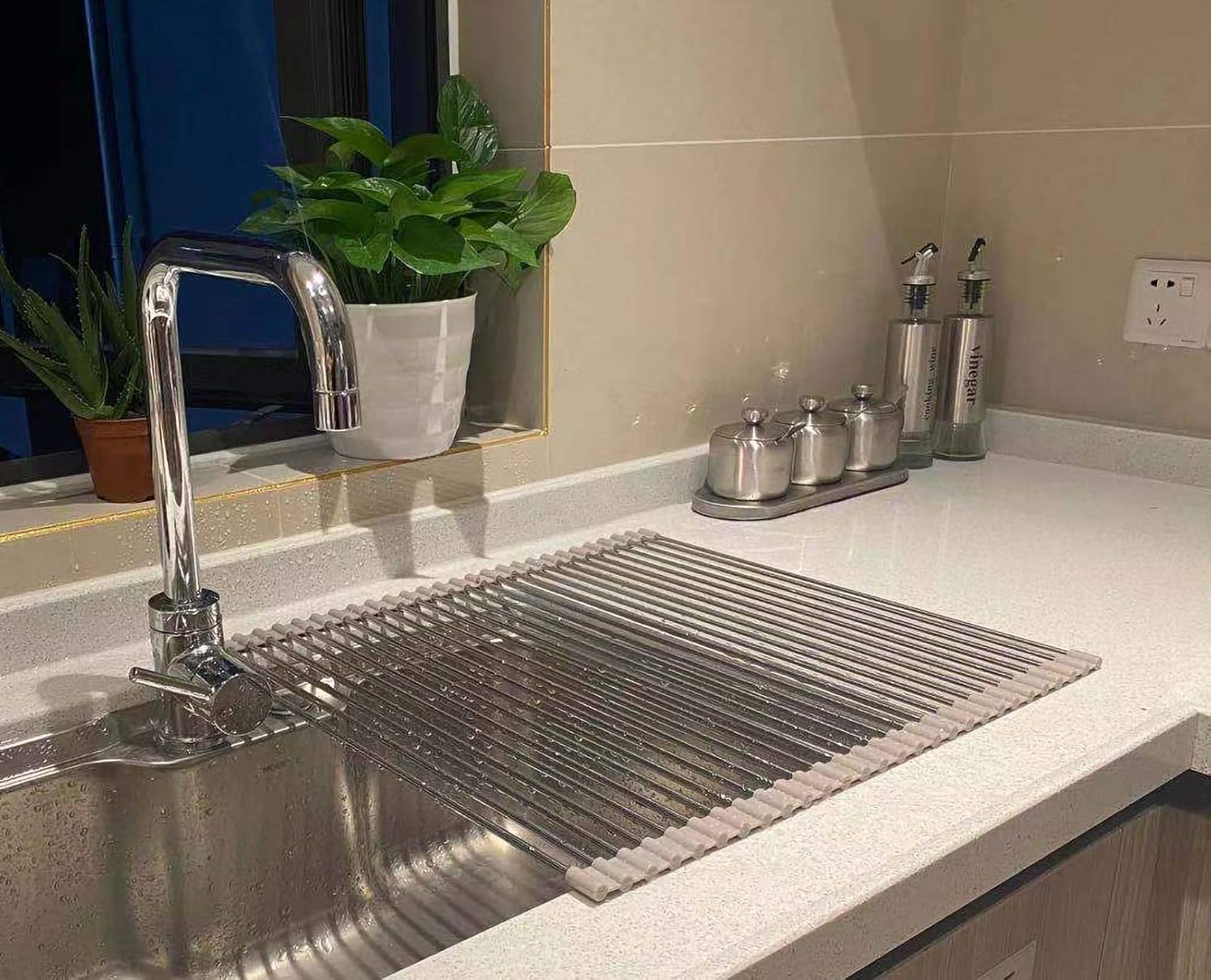 - Roll up Sink Drying Rack and Spacing-saving Dish Drying Mat: This dish drainer can roll up and go in a drawer quickly when not in use. Works great and keeps the kitchen sink area looking neat, the best one of dish drainers for kitchen counter. You can roll up this over the sink dish drying rack as much as you like during using it and for the pipes also can be removable