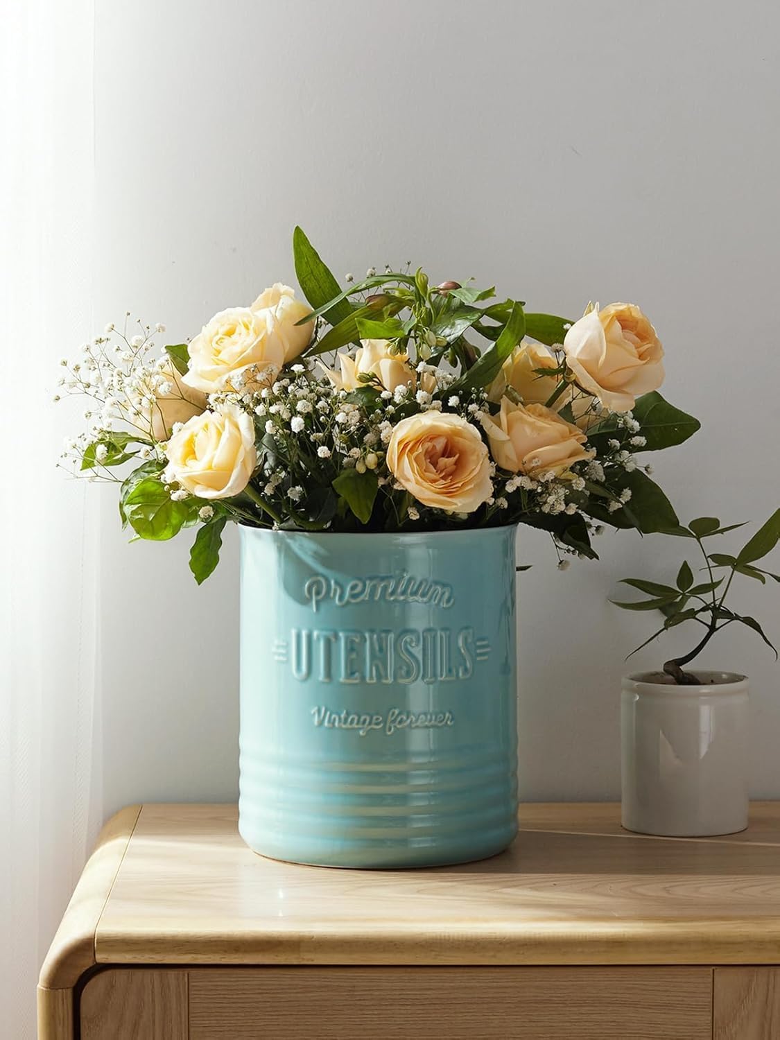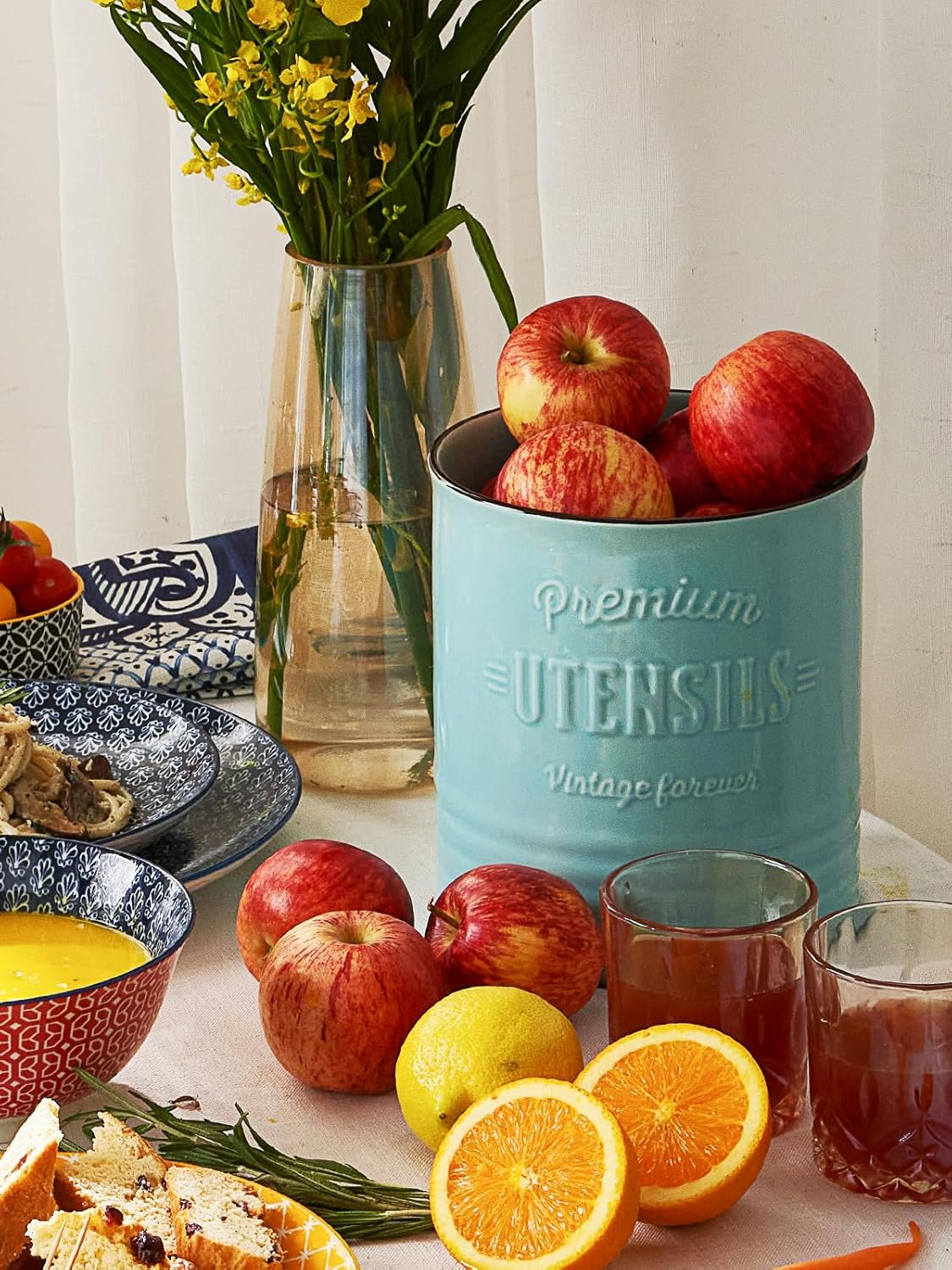 - Farmhouse Country Kitchen Decor. Add a vintage touch to your home decor with this stylish farmhouse utensil holder. This rustic white utensil jar mathches household style and make a beautiful decoration for kitchen countertops