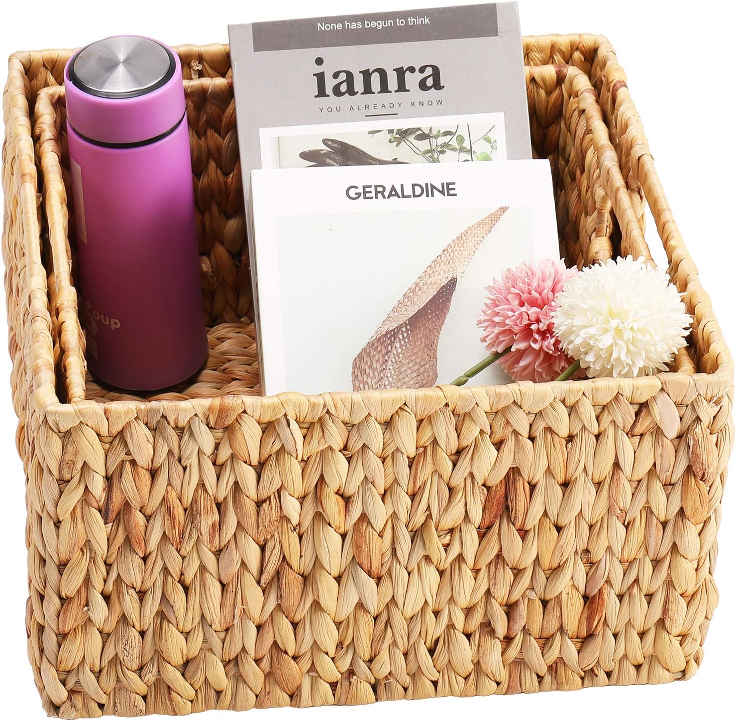 HOONEX Water Hyacinth Storage Baskets for Organizing, Decorative Wicker Baskets with Carrying Handles, Set of 2, Natural