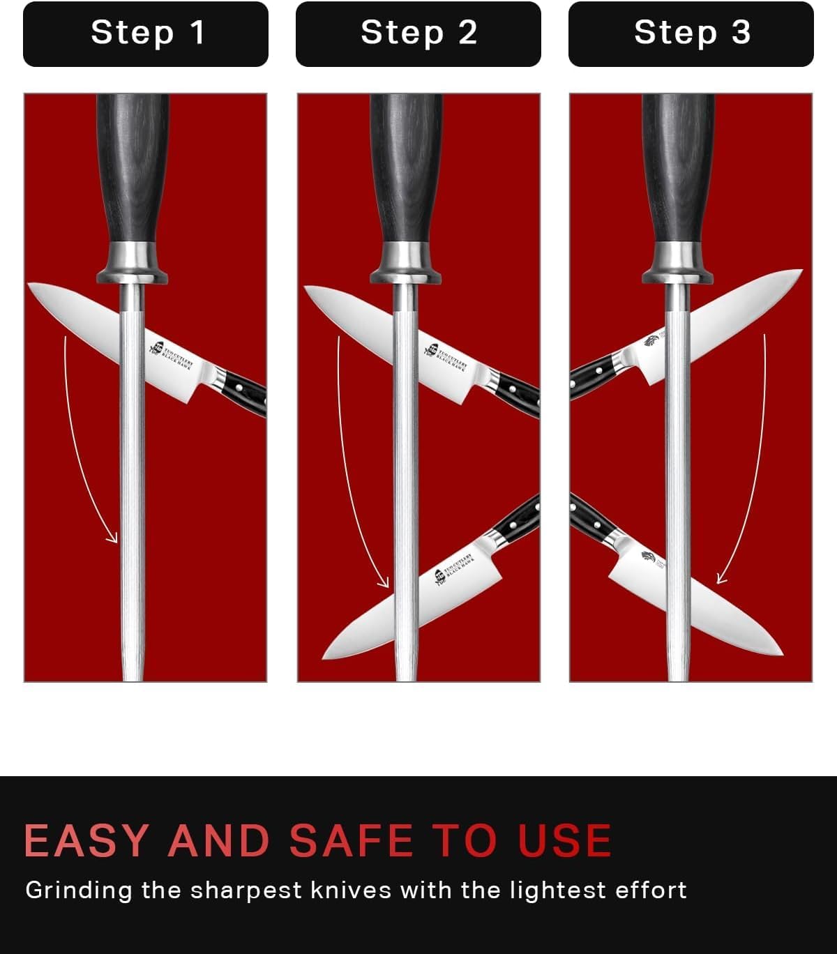 - EASY TO USE: Just slide your knife along the knife sharpening steel at a 15-20° angle. The fine serrated line on the surface ensures efficient sharpening with just a few passes—restoring edge precision in no time.