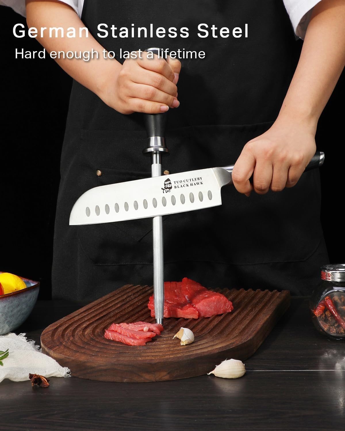 - PREMIUM MAGNETIC GERMAN STEEL: Crafted from high-carbon German steel, our honing rod offers outstanding durability and strength. The fine sharpening steel won't damage your blade edge, while its magnetic surface captures metal particles during honing, making cleanup easier and improving your sharpening efficiency.