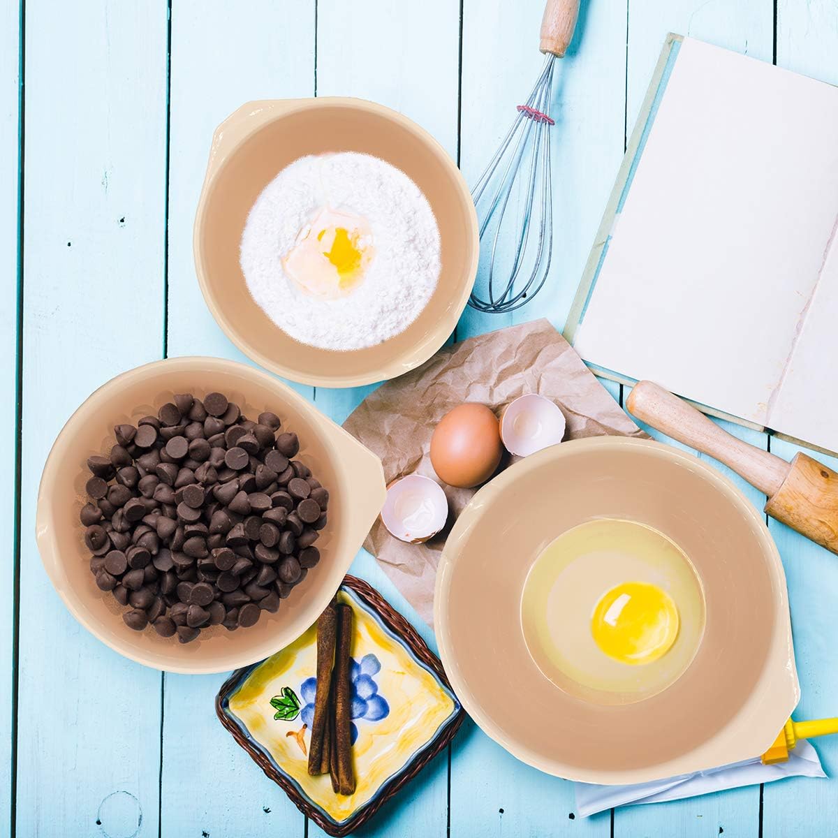 - EMBEDDED POUR SPOUTS β Each bowl is designed with a pour spout on one end and a lip on the other end for easy handling. Perfect for trained chefs, bakers and beginners alike, these bowls make it easy to mix, stir and pour batters or sauces.