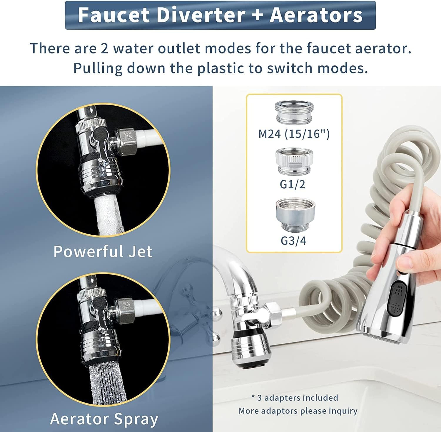 - 【Faucet Aerator & 3-Way Diverter】2 Water Flow Design By pulling down the Aerator, convert soft bubble stream to strong spray. Brass construction Valve with 1 water inlet and 2 outlets, redirect water from the faucet spout to the sprayer. Included adapters: Female 55/64" (22mm) -27T on diverter connector, Male 15/16"(24mm)-27T, G1/2 & G3/4 adapter for Utility/laundry faucet