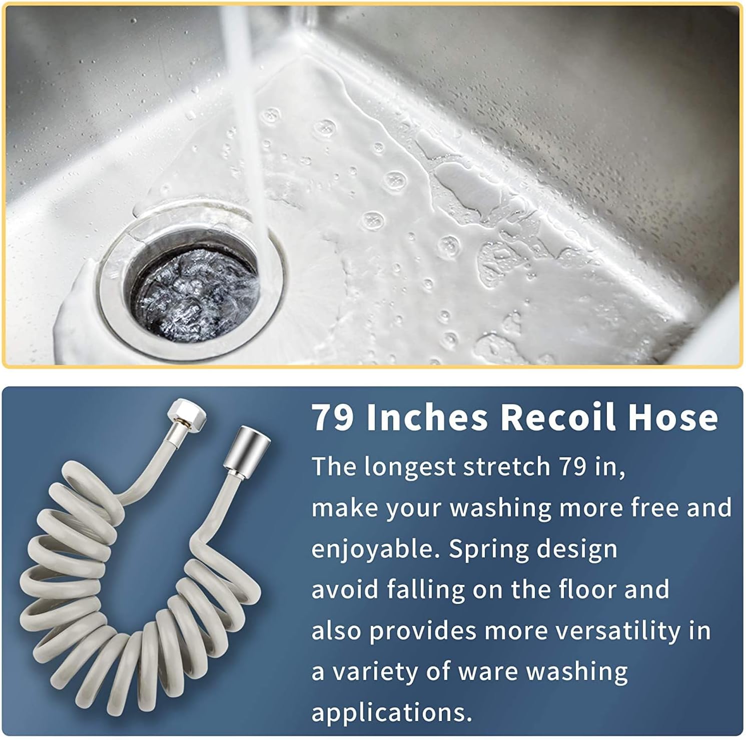 - 【6.6 FT Flexible Faucet Sprayer】The elastic telescopic hose is made of high quality material, non-toxic, explosion-proof and anti-winding. The longest stretch is 6.6 FT, which can be extended beyond the sink, easy to clean large items or remote corners. Flexible Spring design Faucet Sprayer Hose avoid falling on the floor, saves space and provides more convenience