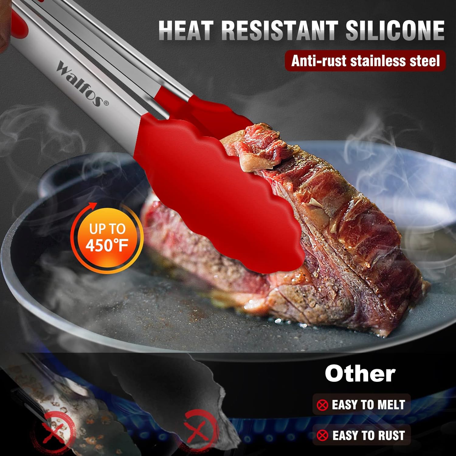 Walfos Kitchen Tongs - 7" 9" and 12" Heat Resistant Cooking Tongs, Stainless Steel and BPA Free Silicone Tips, Great for Cooking, Salad, Grilling, Turning, Dishwasher safe,set of 3