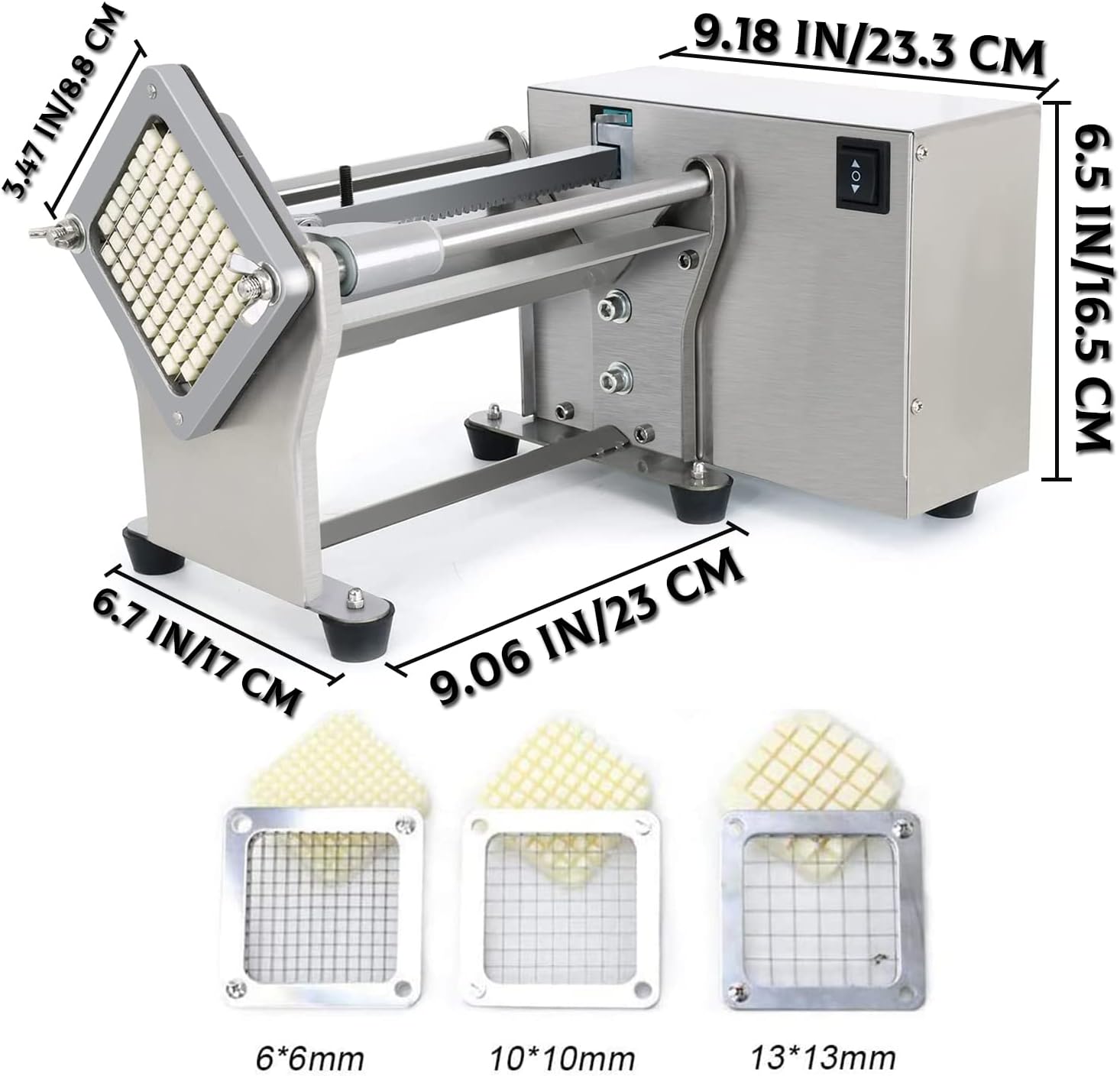 French Fry Potato Cutter Machine Electric Cutting Slicer Chipper Automatic Potato Cutter with 3 Sizes of Replaceable Blades Stainless Steel for Commercial Industrial Kitchen Restaurant Use
