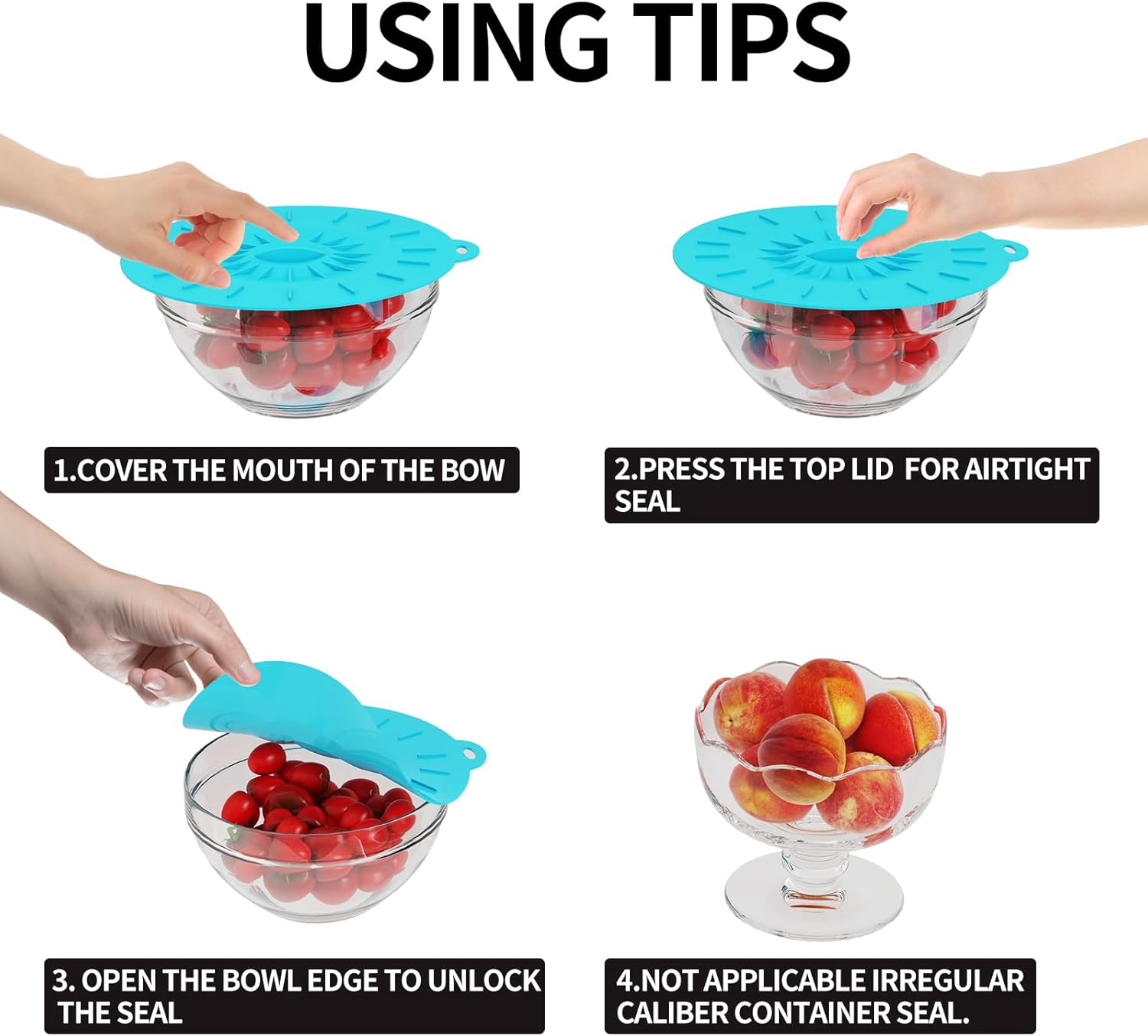 - 【How to Use】 : Make sure the Cover's Size is larger than your Bowl's Mouth Size, and then cover the mouth of the Bowls; Press the top lid, make sure it can be sealed closing for airtight seal; Open the bowl edge and unlock the seal. Please note that the cover is not applicable irregular caliber container seal.