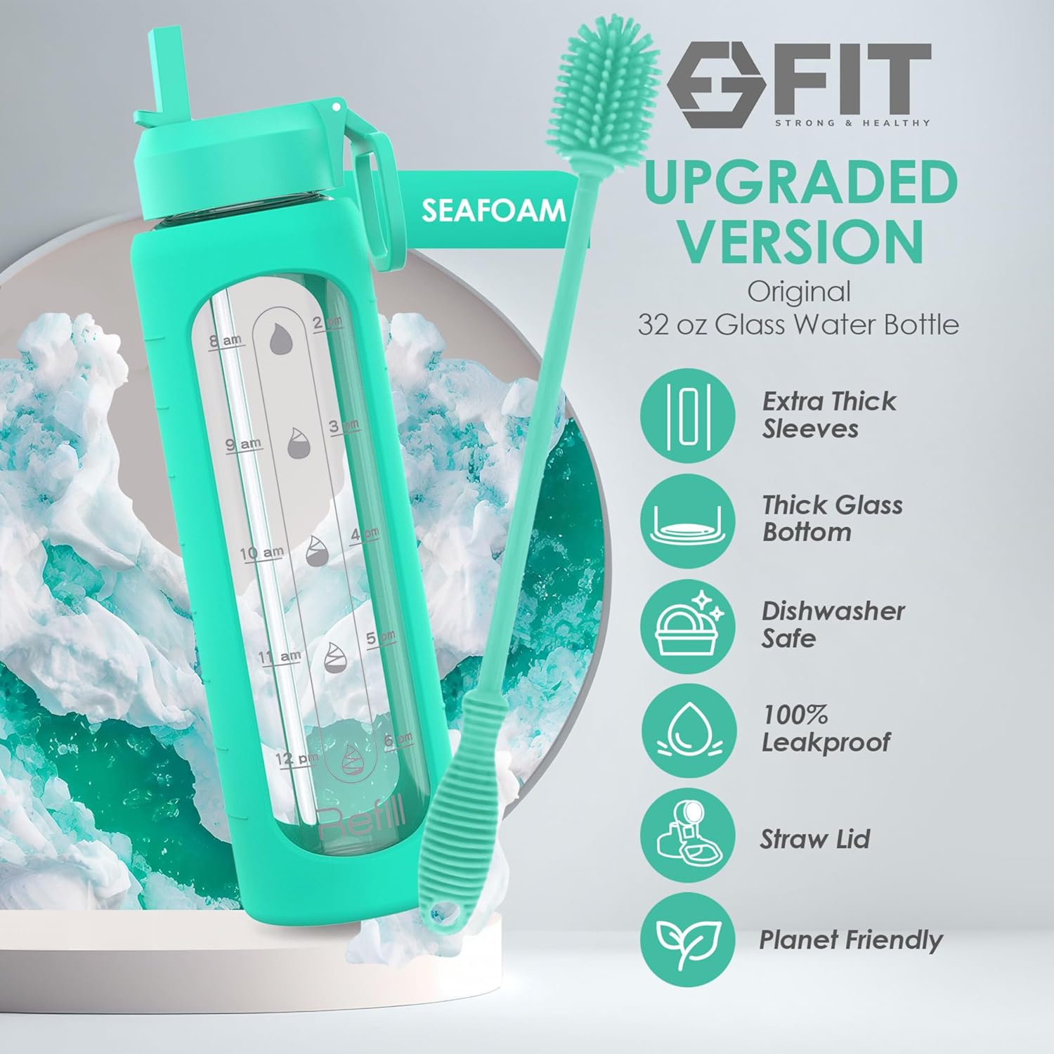 - Water Bottle and Cleaning Brush Set: Upgrade your hydration routine with our 32 oz Glass Water Bottle with Time Marker and Cleaning Brush Set; this version features an extra thick silicone sleeve for extra protection, insulation, and a secure grip; we've also upgraded one of the lids to a straw lid for sipping on the go; the 32-inch Water Bottle Brush is made from durable silicone material, which effectively removes dirt and residue; plus, it does not absorb unpleasant odors and stains
