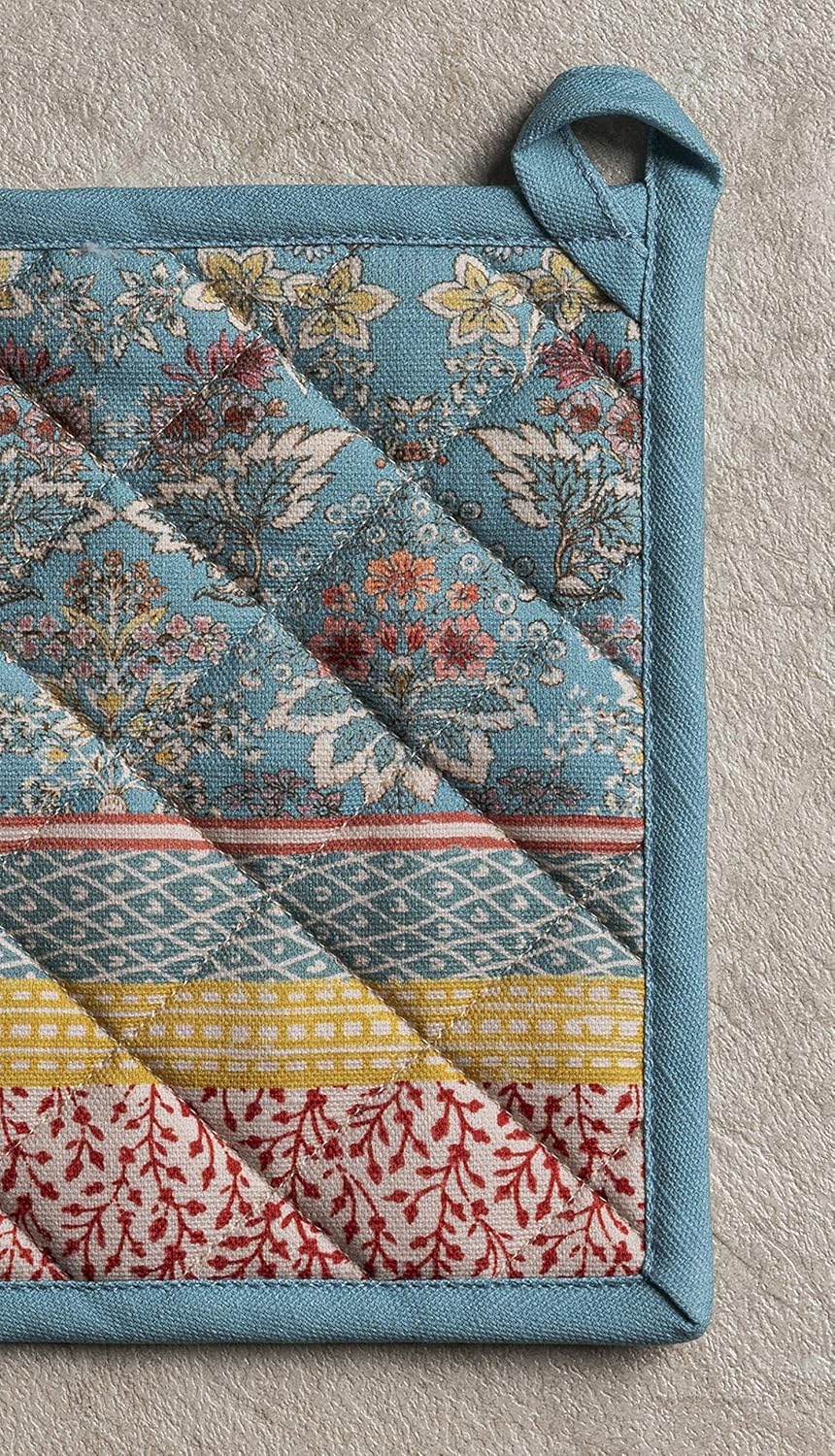 - Package includes: 1 pot holder measures 8"x8". Ideal as a hot pad for dishes, coffee pots, cast iron pans, or cookware. Designed in Europe and Made in India, it blends style, function, and comfort into a daily kitchen essential