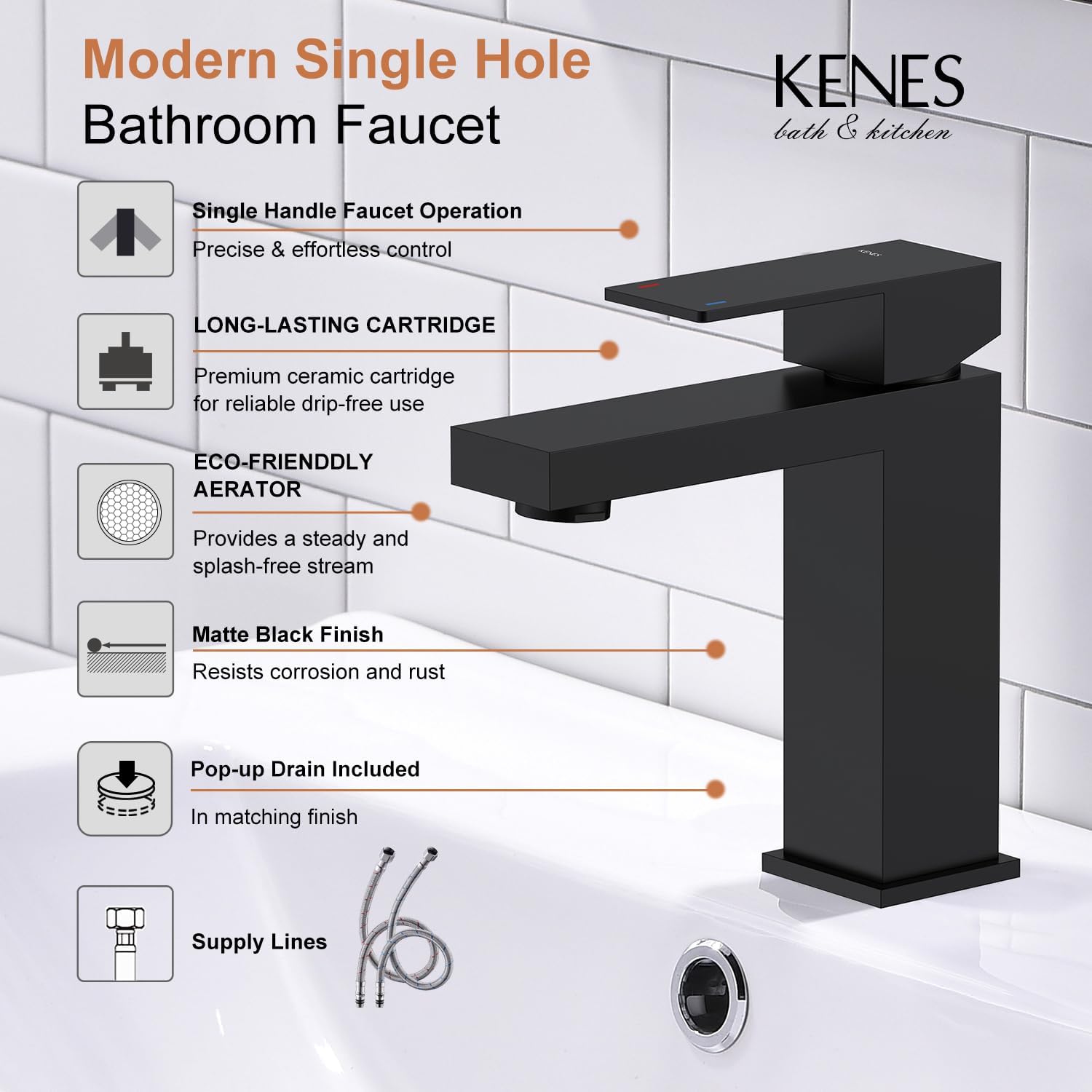 KENES Matte Black Single Handle Bathroom Sink Faucet, Stainless Steel Vanity Faucet for Bathroom Sink, with Pop Up Drain Stopper & Water Supply Hoses LJ-9031-2