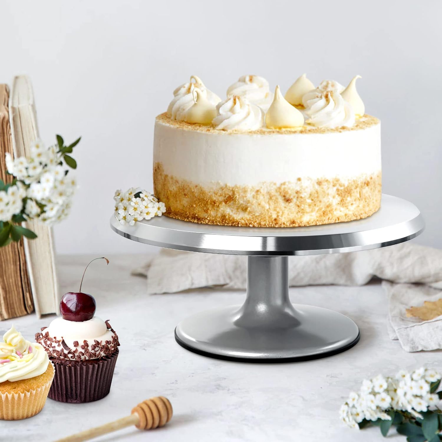 - 【Safe Heavy Aluminium Materials】: Comparing to plastic cake stand, this cake stand turntable is constructed with heavy aluminium alloy at N.W 2000g, size at 12.2"x 7"x 5.3", which can provide enough force to achieve an excellent stability and keep the cake stand from moving
