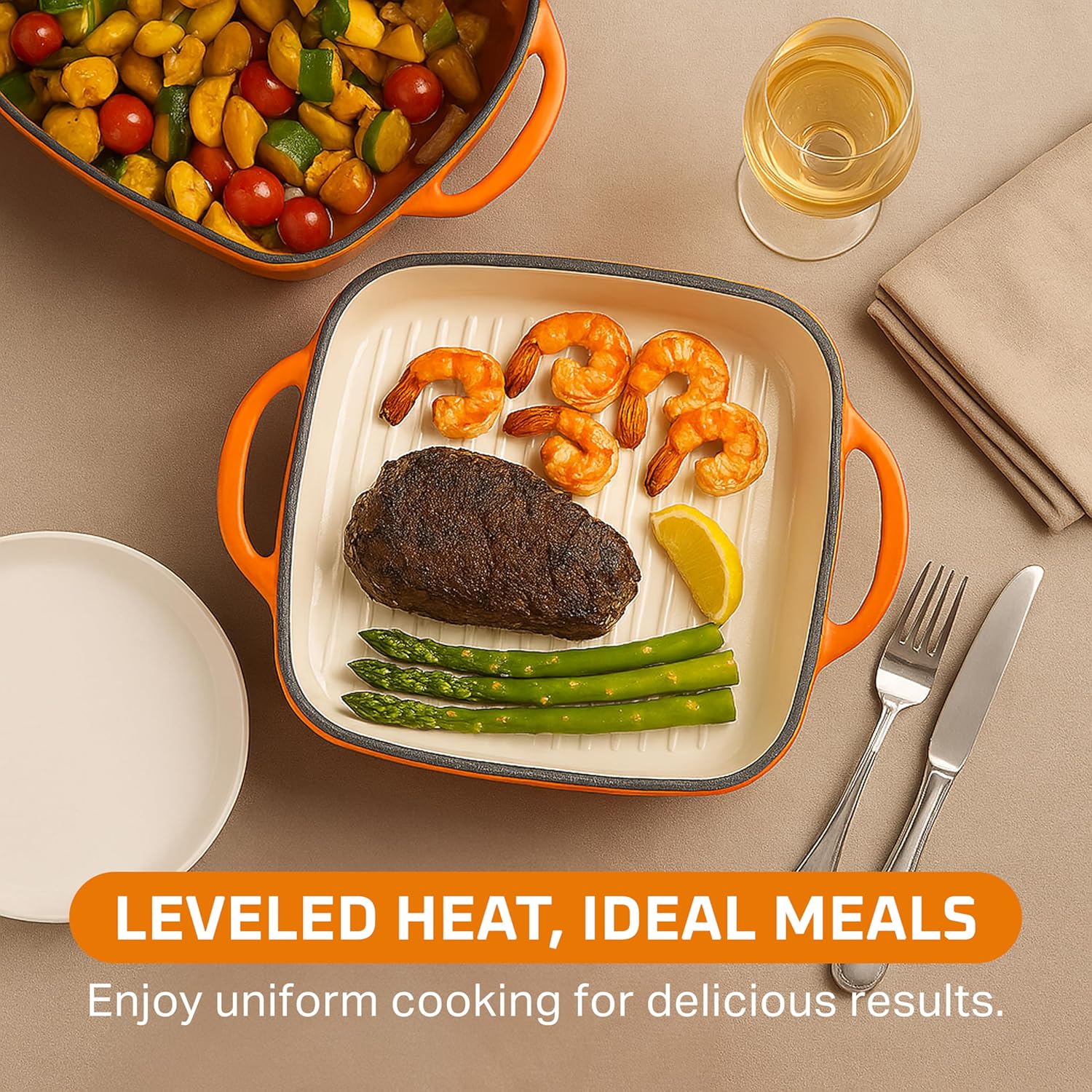 Bruntmor 2-in-1 Square Pumpkin Spice Cast Iron Dutch Oven With Handles, Enamel All-in-One Cookware Set, Braising Pan For Casserole Dish, Crock Pot Covered Cast Iron Skillet