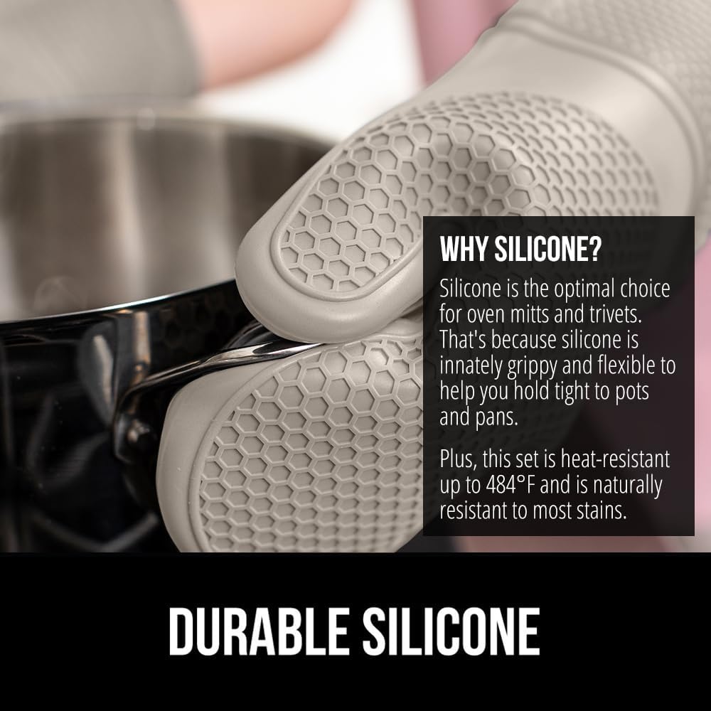 - WATERPROOF AND STAIN RESISTANT: no more constantly stained oven mitts and trivets; Gorilla Grip Silicone Mitts and Trivets are both stain resistant and waterproof; spills can easily and instantly be rinsed away under water; hot liquids wonβt soak through and scald your skin as they would with other materials; trivets are also dishwasher safe