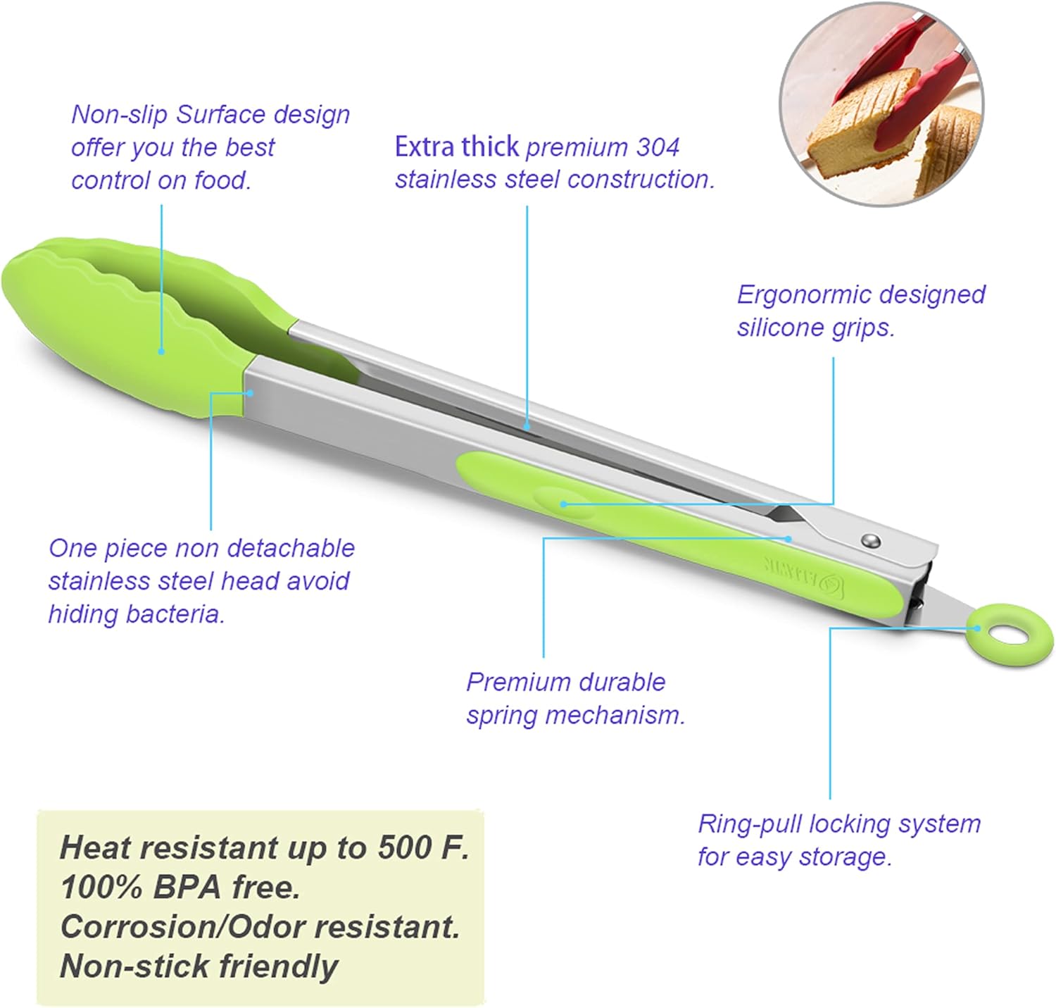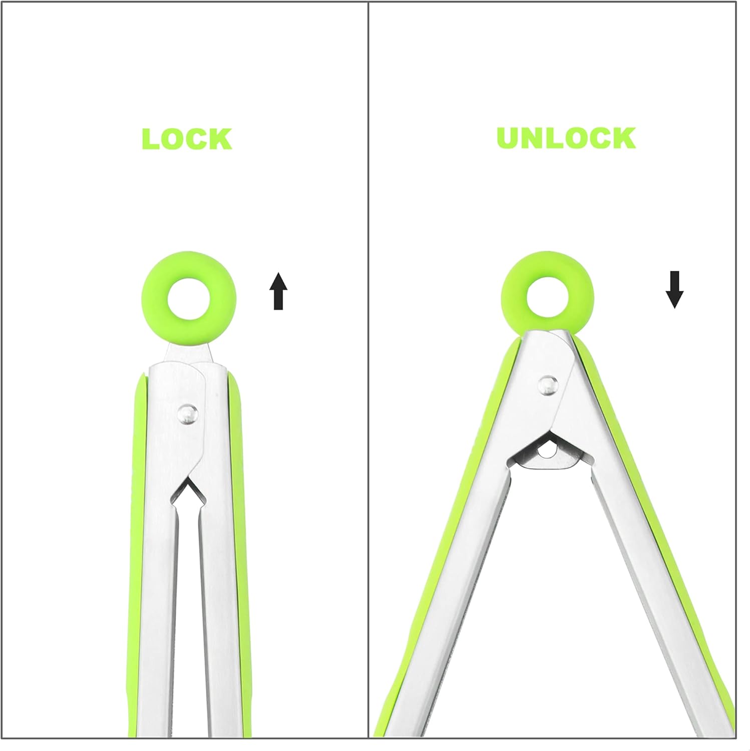 4 Pack Green Kitchen Tongs, Premium Silicone BPA Free Non-Stick Stainless Steel BBQ Cooking Grilling Locking Food Tongs, 9-Inch & 12-Inch