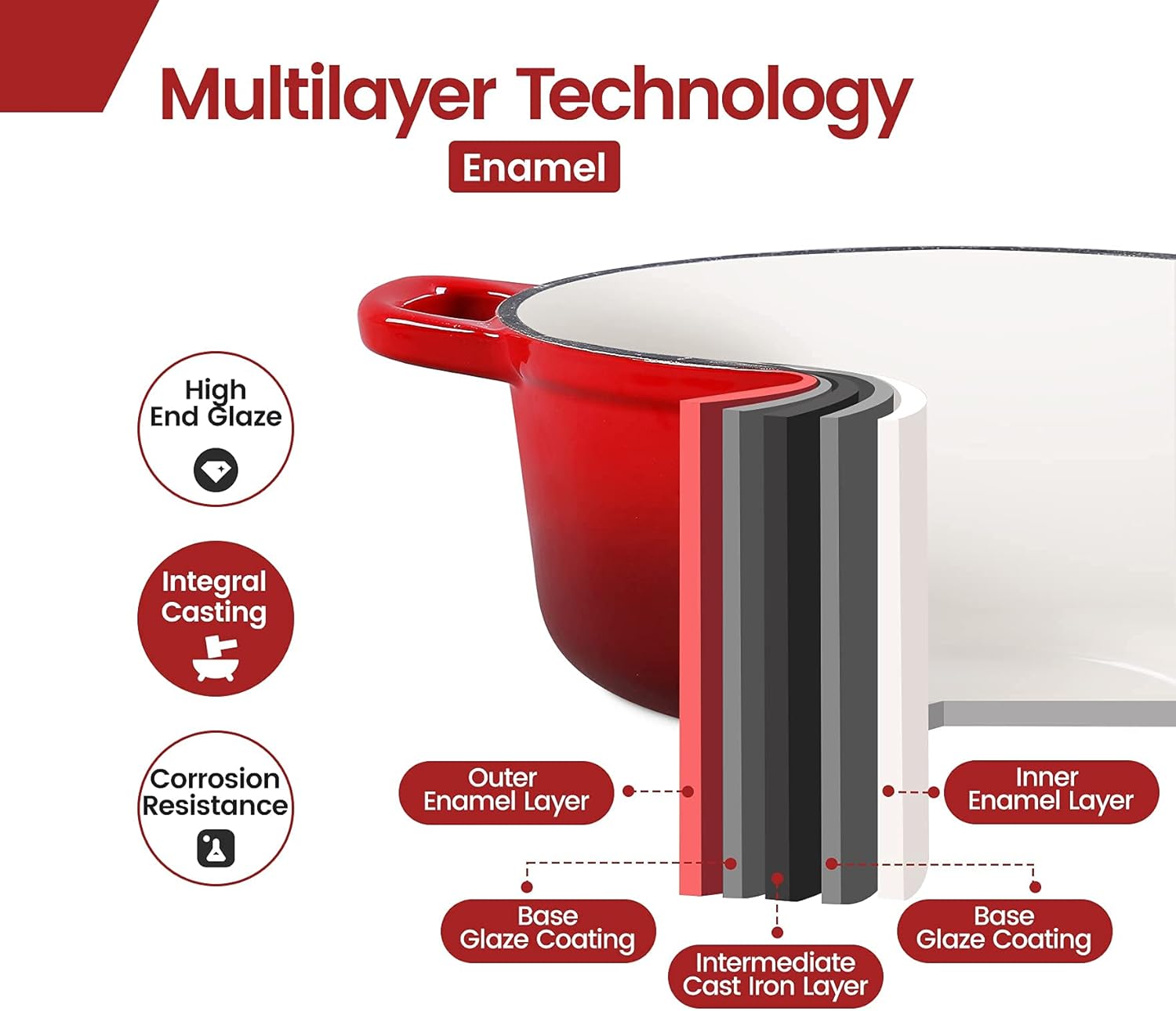 - Suitable for 6-7 people: The 5.5 quart enamel Dutch oven is the choice for cooking food and desserts. Its design makes your food look more delicious
