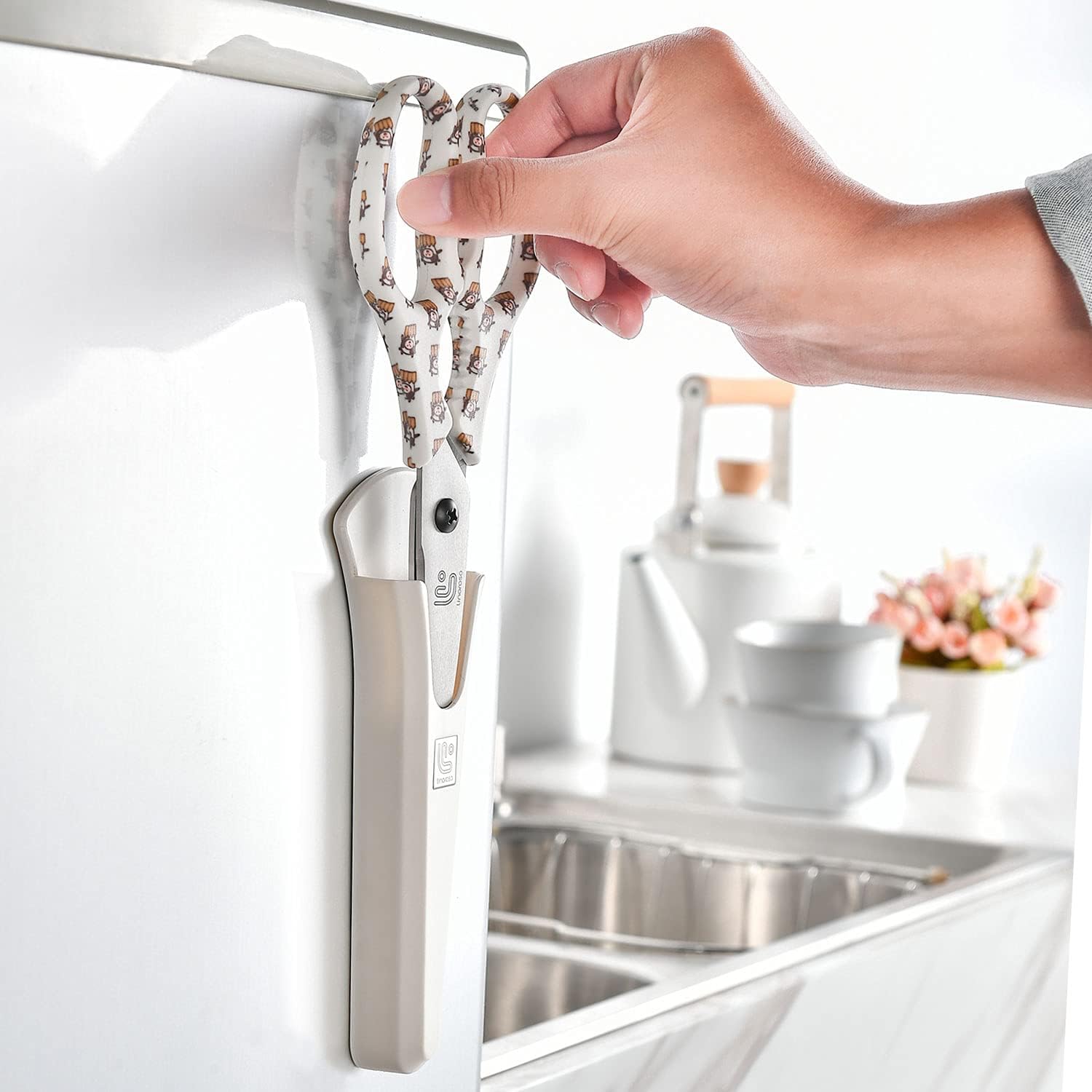 - Magentic Holder Design: The ergonomically and high quality material designed handle ensures precise cutting in various tasks, and magnetic scissors holder design can attach the shears on refrigerator and any metal surface to stay your safe. Meanwhile, the included guard protects the blades, help you and kids avoid accidental injury. The bottom hole of holder allows the shears to ventilate dry