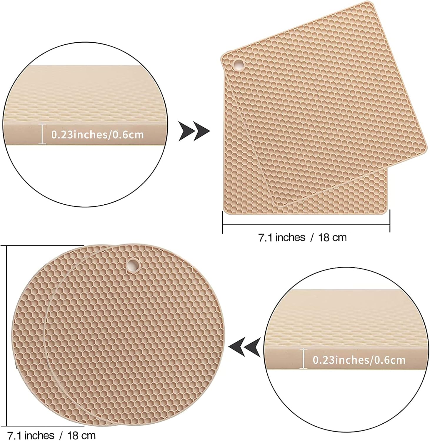 - CIRCLE AND SQUARE SILICONE POT HOLDER: Protect your hands, pans, and countertops with our silicone trivet pack that includes 2 round and 2 square honeycomb silicone pot holders.