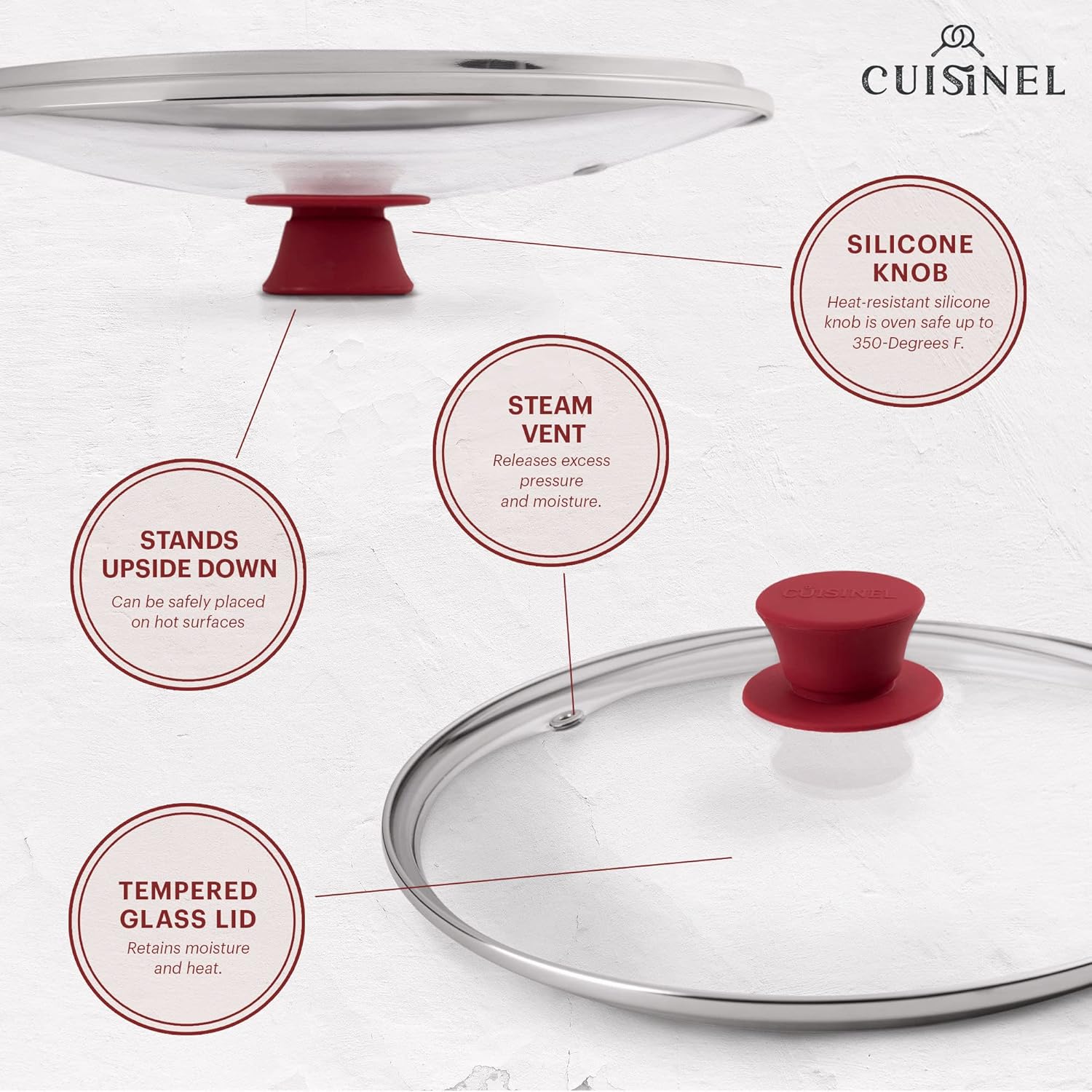 - STEAM VENT HOLE: Cuisinel's professional quality lids β now updated with steam vent holes to prevent liquid from boiling over. Vent holes allow just the right amount of moisture to evaporate easily so your food doesn't saturate in liquid. Vent holes make sure the glass lid doesnβt cloud up β allowing you to easily see cooking progress without removing lid.