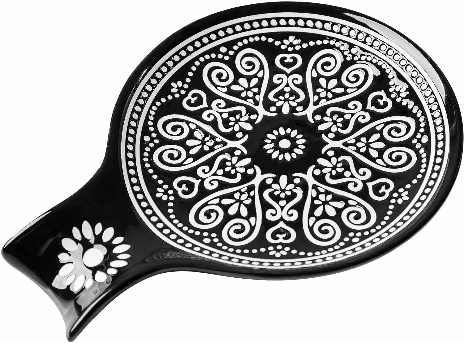- PRACTICAL COUNTER DECORATIVE: The spoon holder is made of ceramic, with black background and white patterns; The ceramic spoon rack is the perfect decoration for kitchen countertops, stove tops, dining tables, coffee bars, and farmhouses