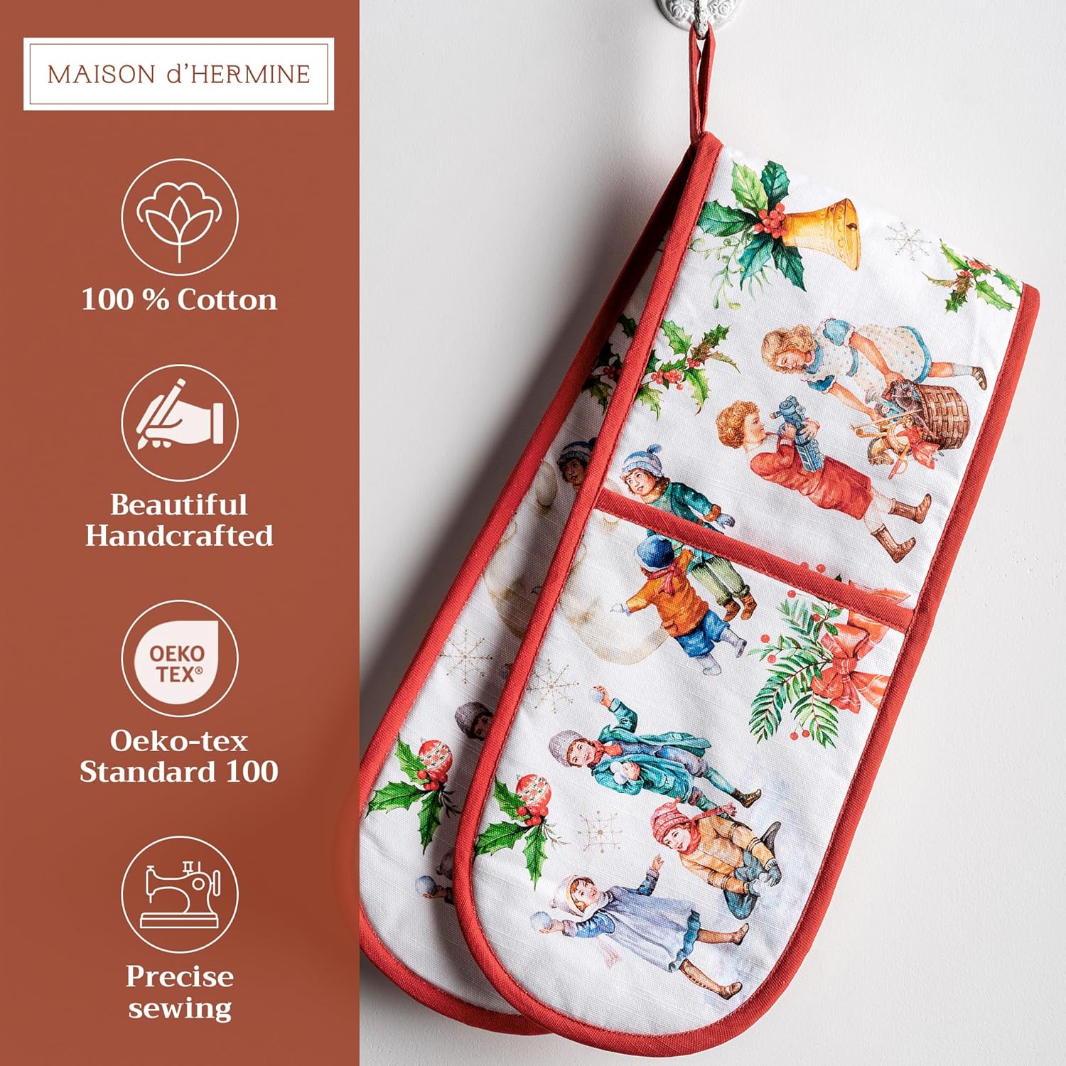 Maison d' Hermine Double Oven Mitts 100% Cotton 7"x35" Double Oven Mitt Heat Resistant BBQ Cooking Gloves with Loop, Baking, Grilling, Home, Kitchen, Handling Hot Pans (Chromo)
