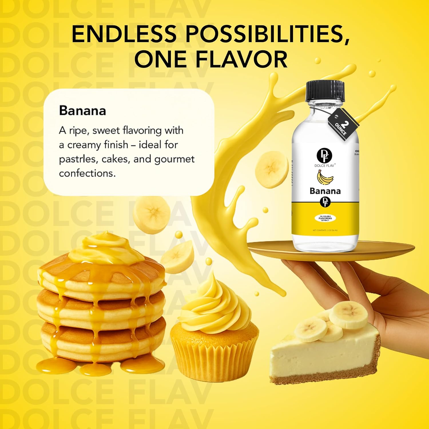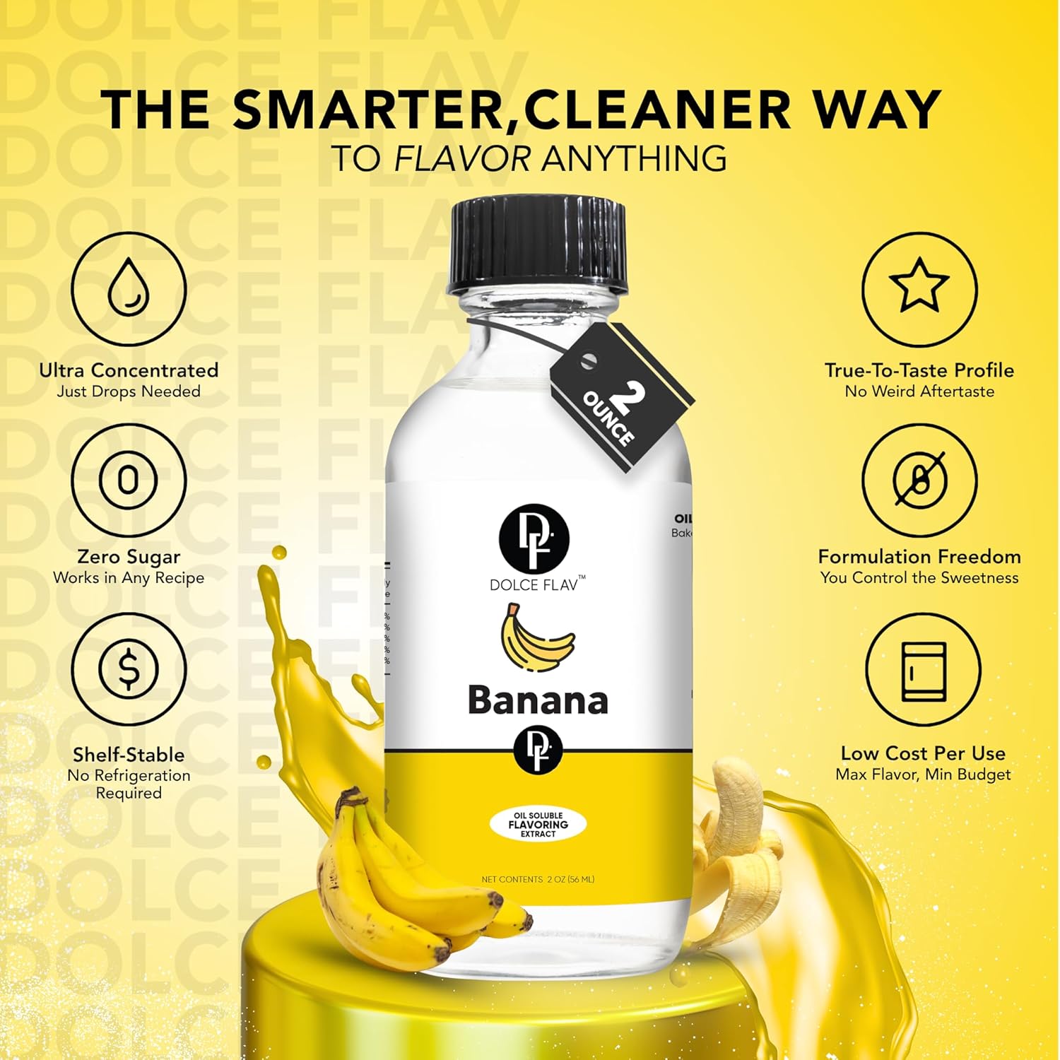 Dolce Flav Banana Extract – 2 Ounce Oil-Soluble Kosher, Sugar-Free, Concentrated Ripe Banana Flavoring for Baking, Smoothies & Ice Cream, Includes Measured Dropper