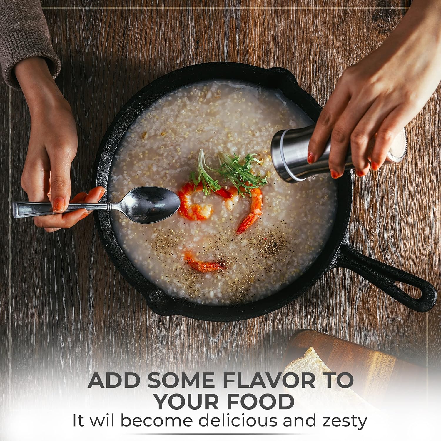 - ✅ Choose your spice – Fill the Shaker with your favorite spices like: Sea, Himalayan, Table or Kosher Salt, Black, White, Four-color Pepper, or any other seasoning you can imagine. Adding your favorite spices will enrich your food on any meal. *Spices not included