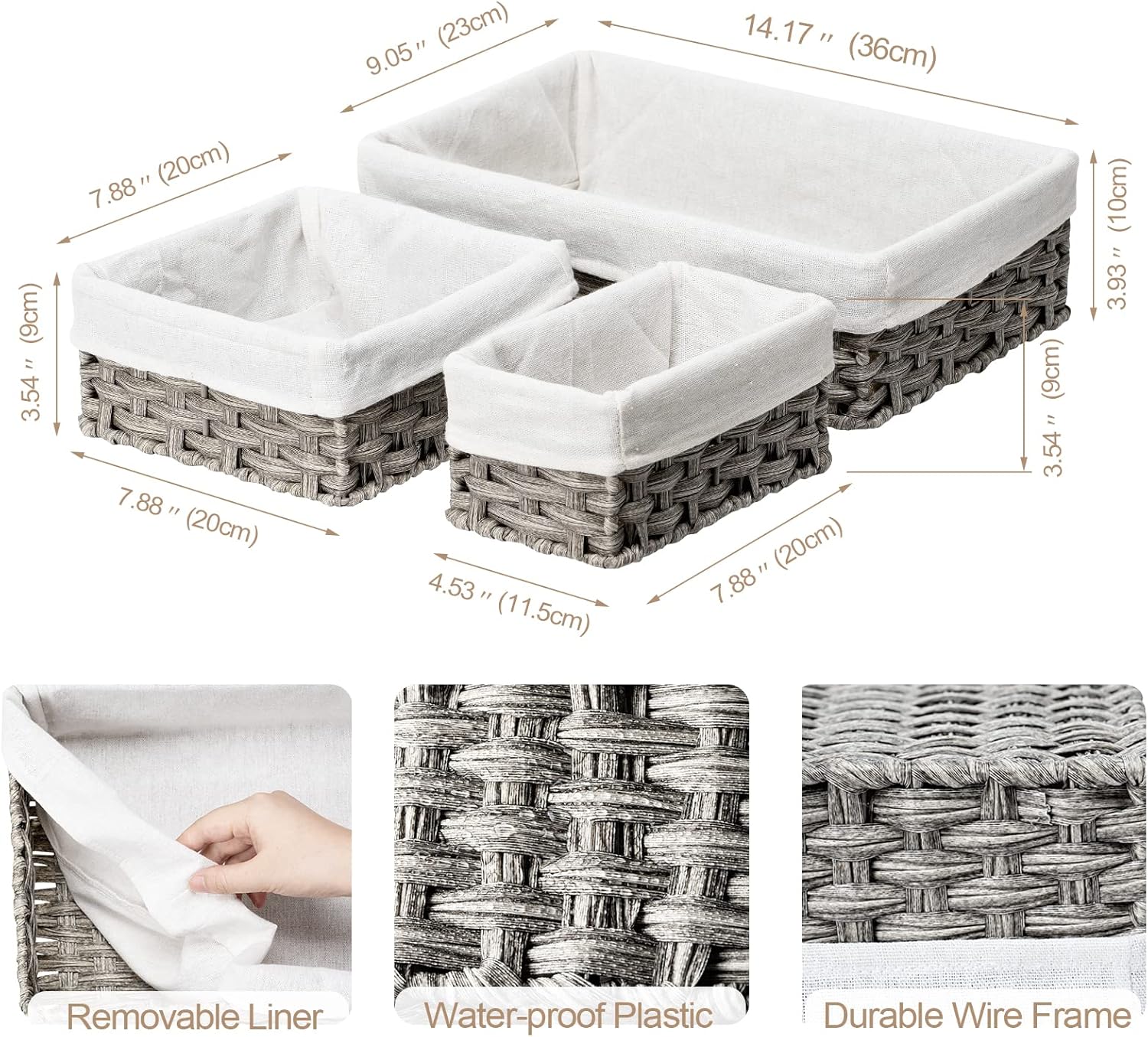 - Waterproof Material & Removable Liner: Small wicker basket made of durable plastic, which is water-resistant, durable and easier to clean. Wicker baskets for organizing featured with Liner, which is removable and washable, convenient for daily use. (Please note: the liners are packed inside, please take out the 2 smaller baskets and put liners into suitable wicker baskets.)