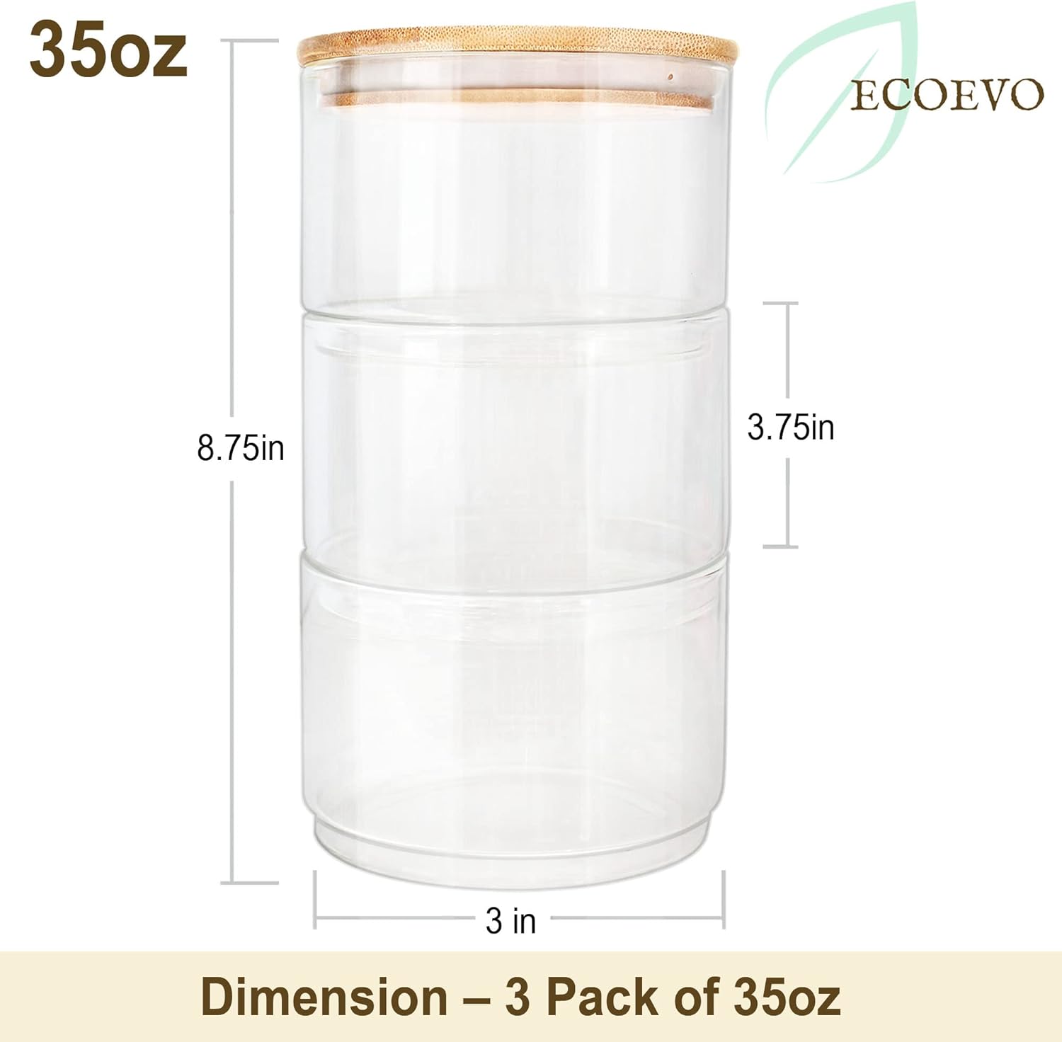 - ✅VALUE PACK COMBO: EcoEvo brings you these high quantities high value for dollar sets; We carefully chose the most popular size for our glass jars sets; EcoEvo air tight canisters are specially designed in different heights and large quantity pack combinations for multiple uses; All of them are stackable for space saving storage, the silicone ring makes the bamboo lid close tightly, which makes sure food inside stays dry and fresh for a much longer time